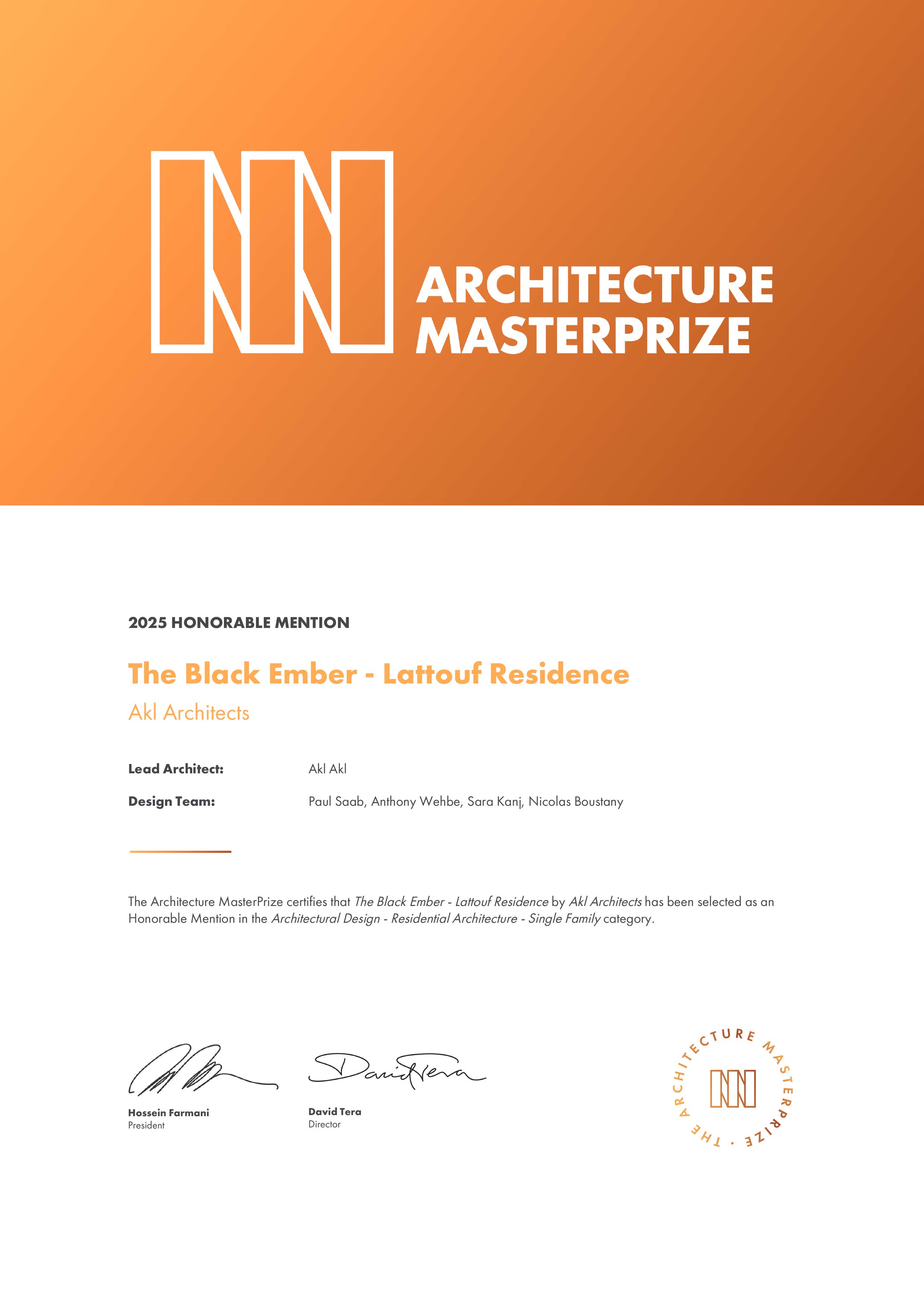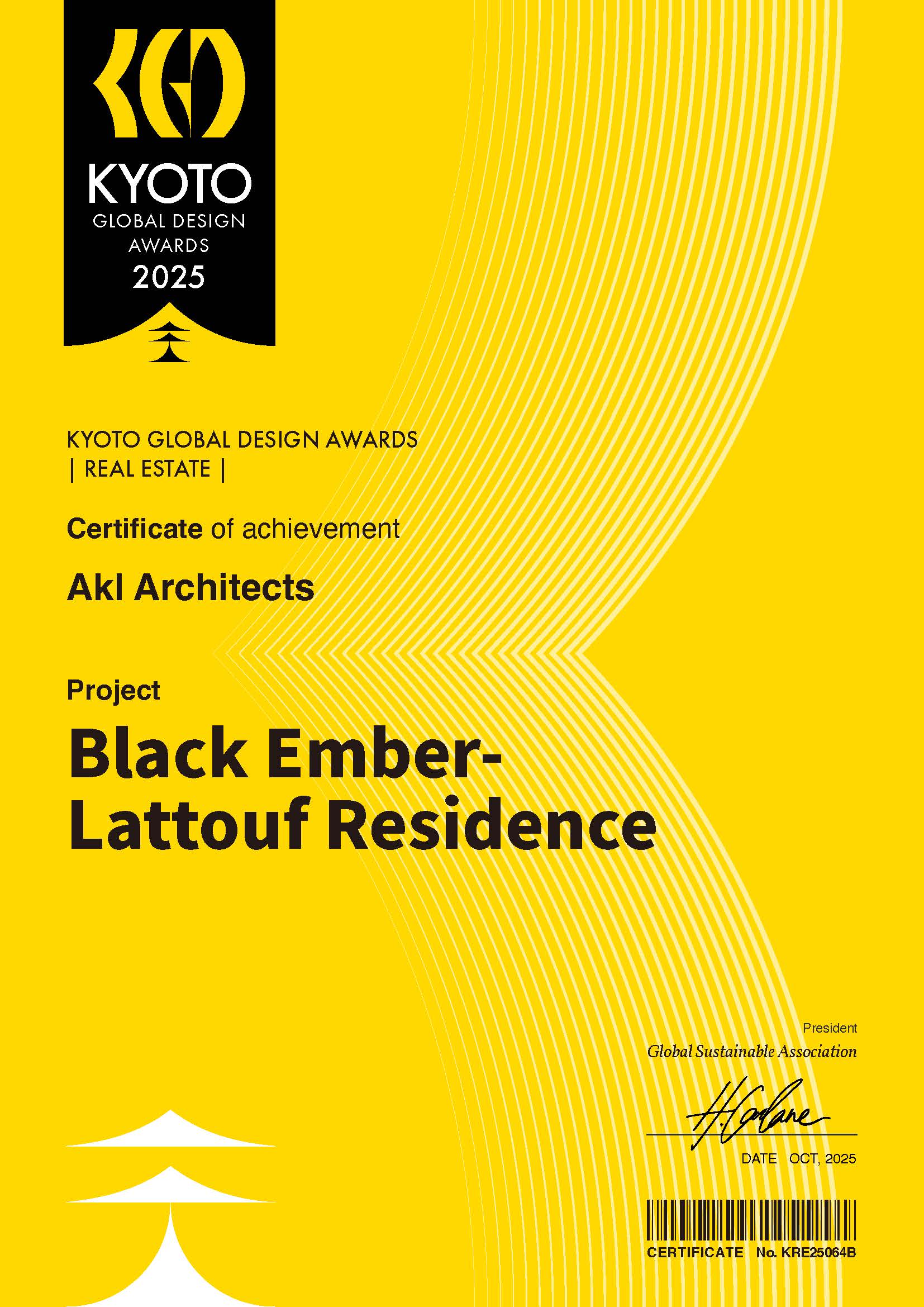 KYOTO GLOBAL DESIGN AWARDS 2025 - Certificate of achievement - Black Ember Residence , Lebanon