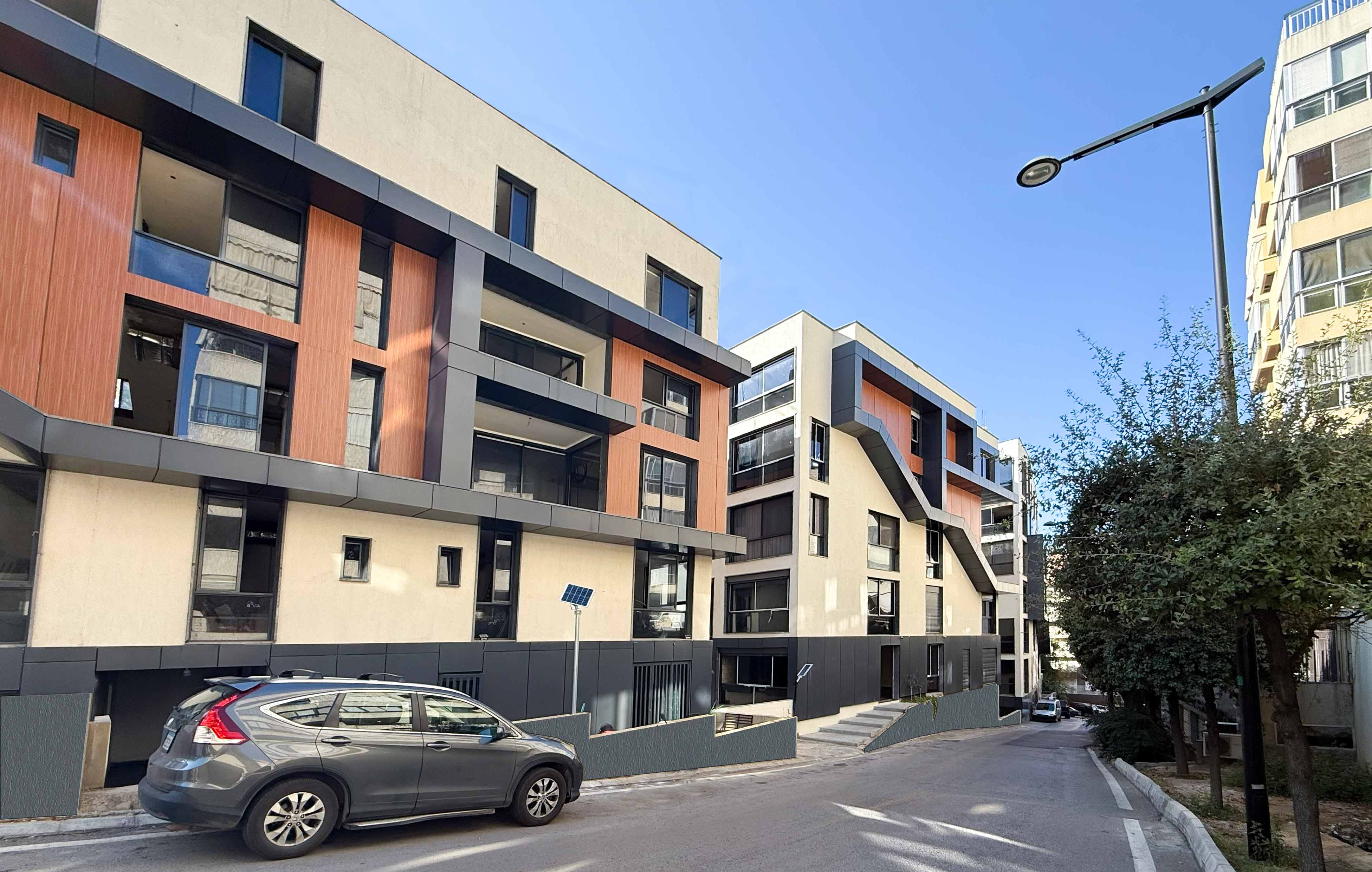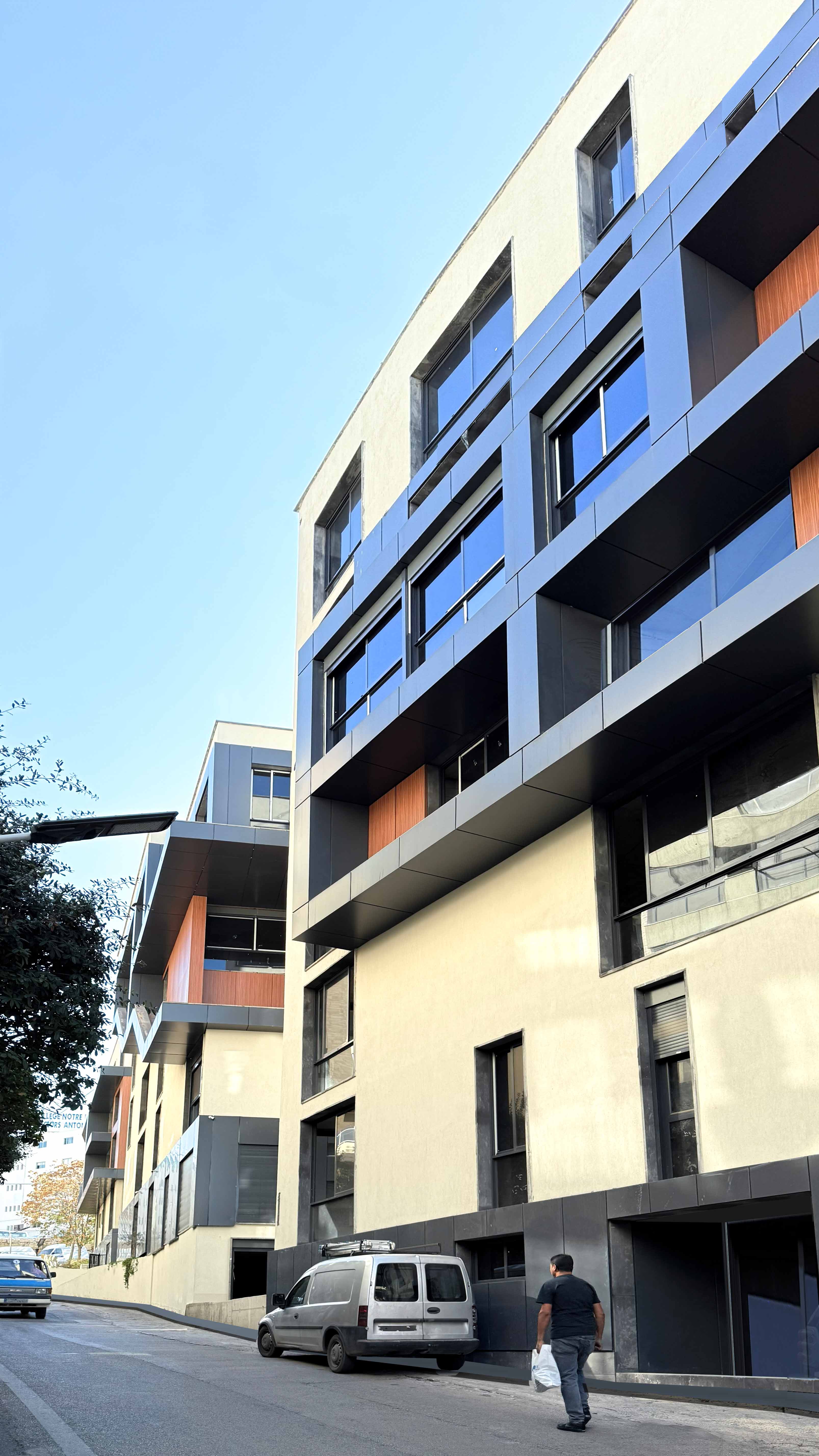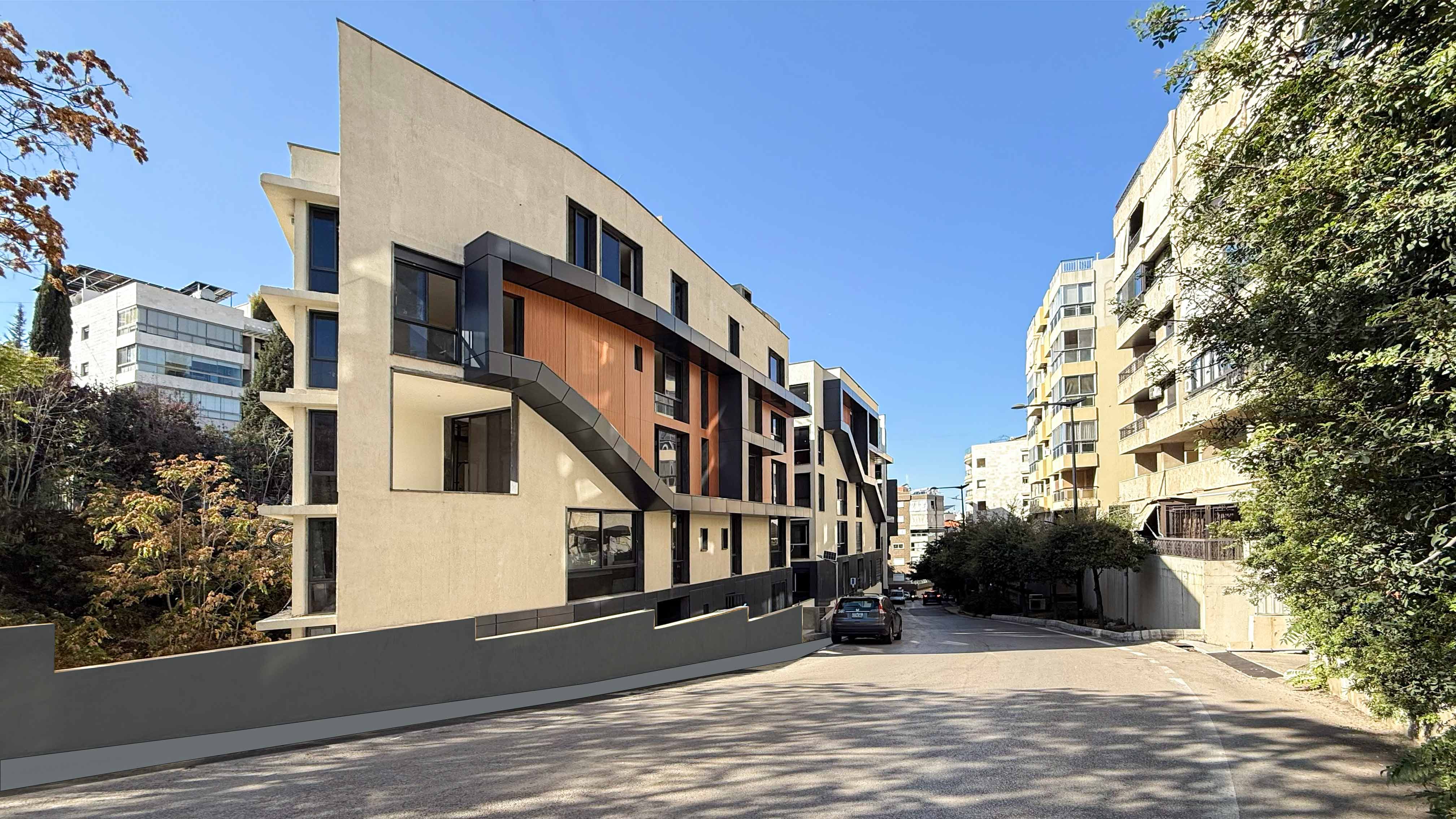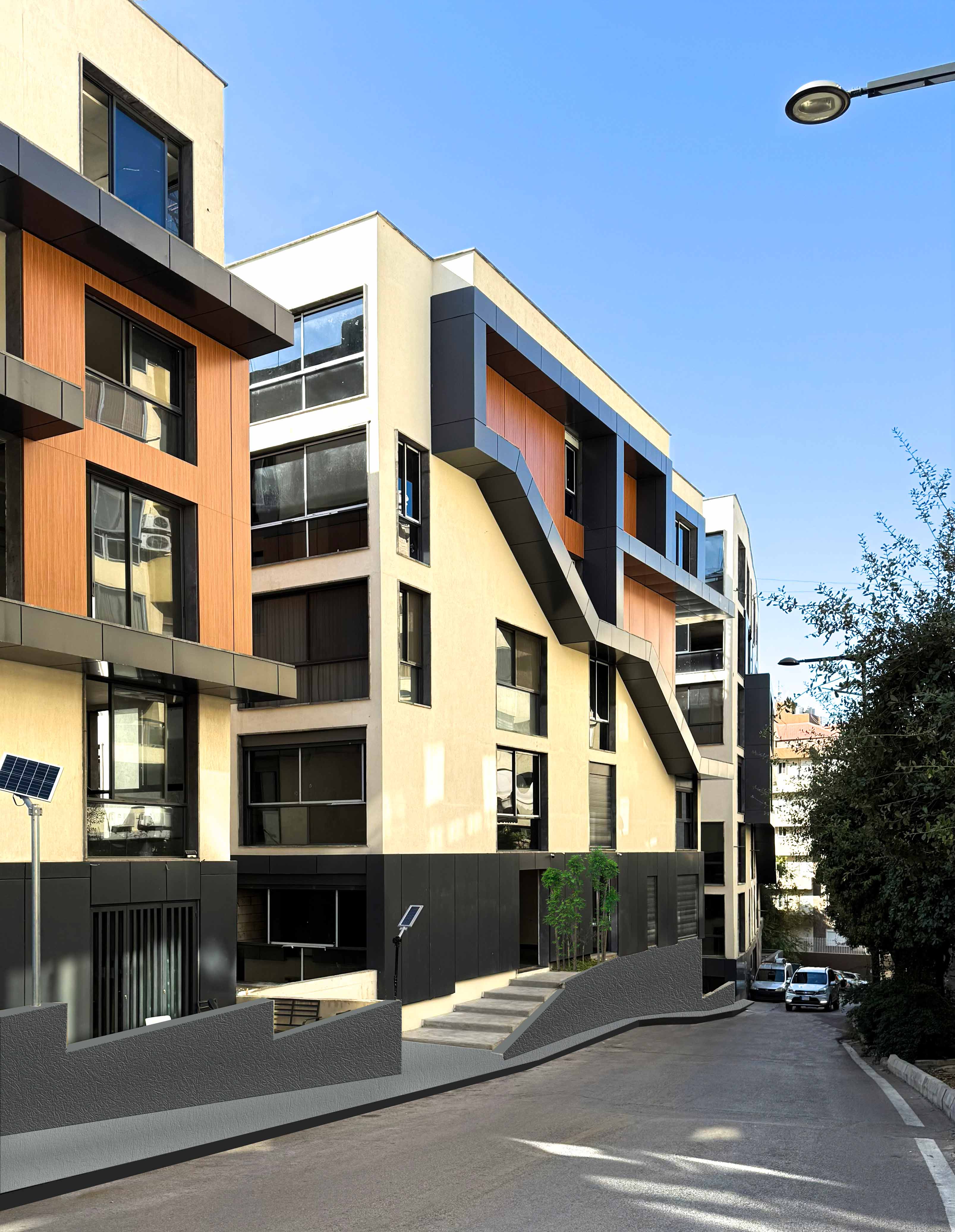 Each face shows a different number of apartments, the overall elevation unified by an urban scaled stairs carving.