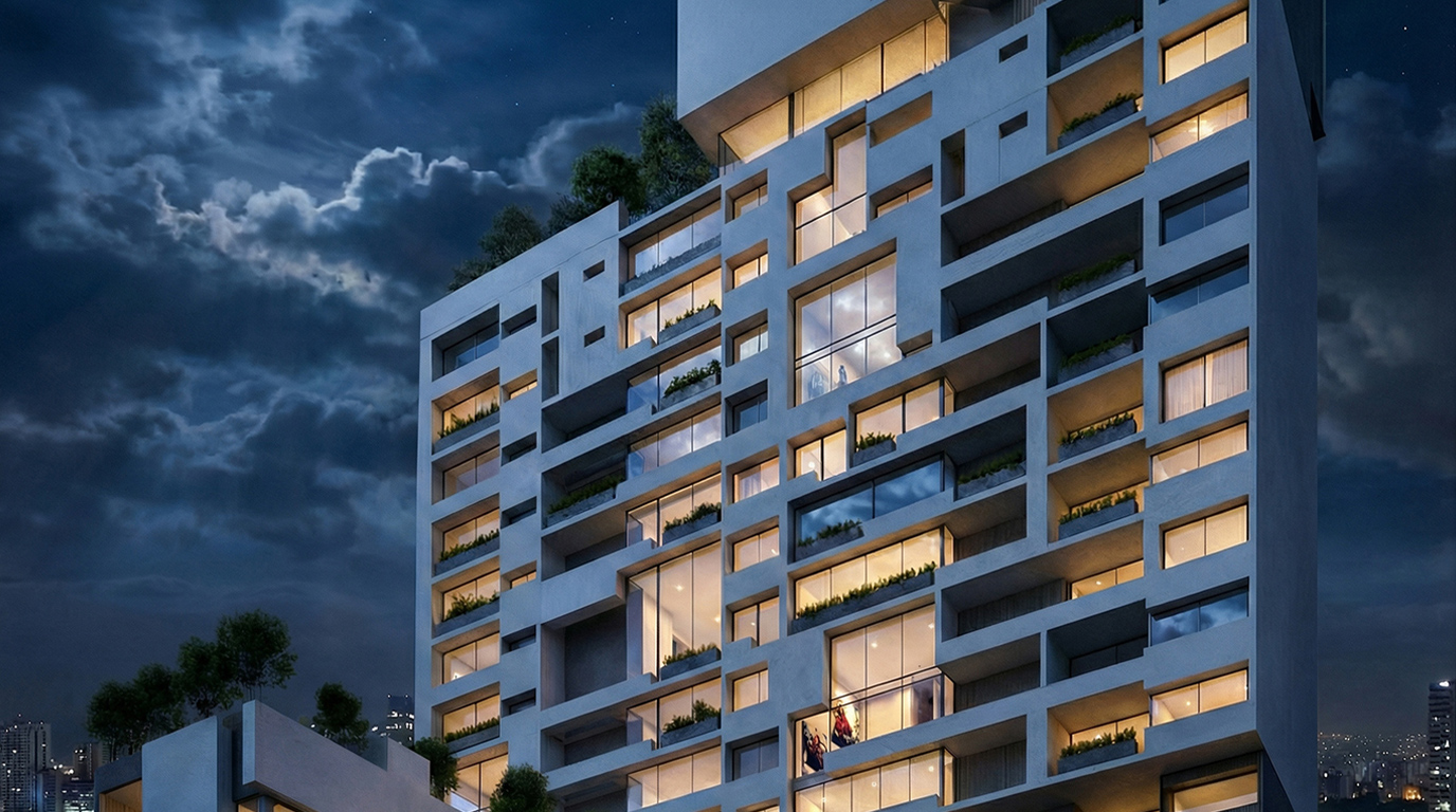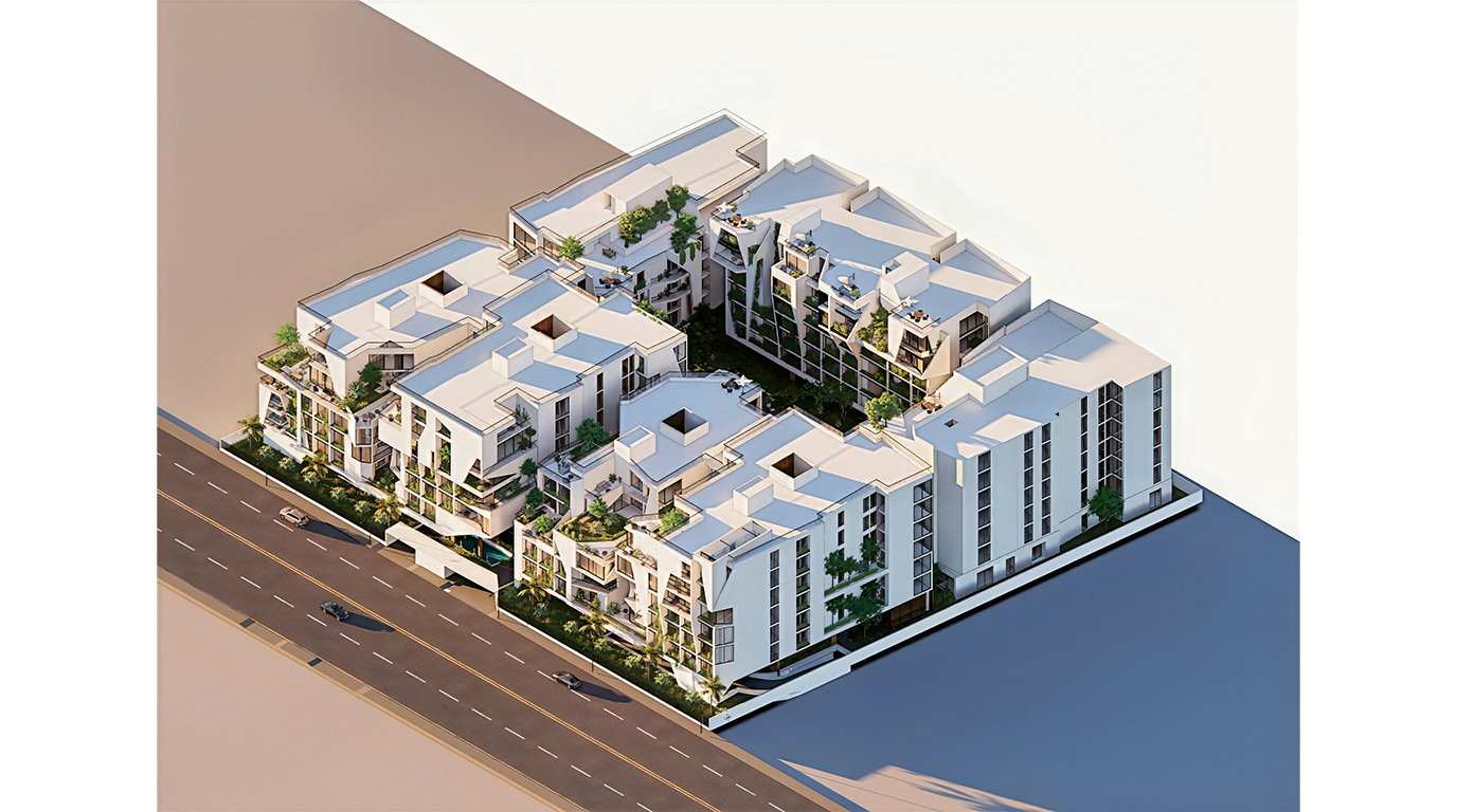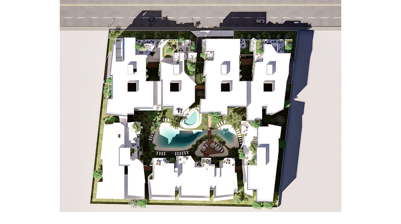 Strategically positioned along the peripheral edges of the plot, these blocks create a central void that houses a beautifully organic-shaped pool, serving as a focal point for residents. The design of the blocks incorporates a fragmented upper floor system, allowing natural sunlight to penetrate the deepest areas of the public spaces.