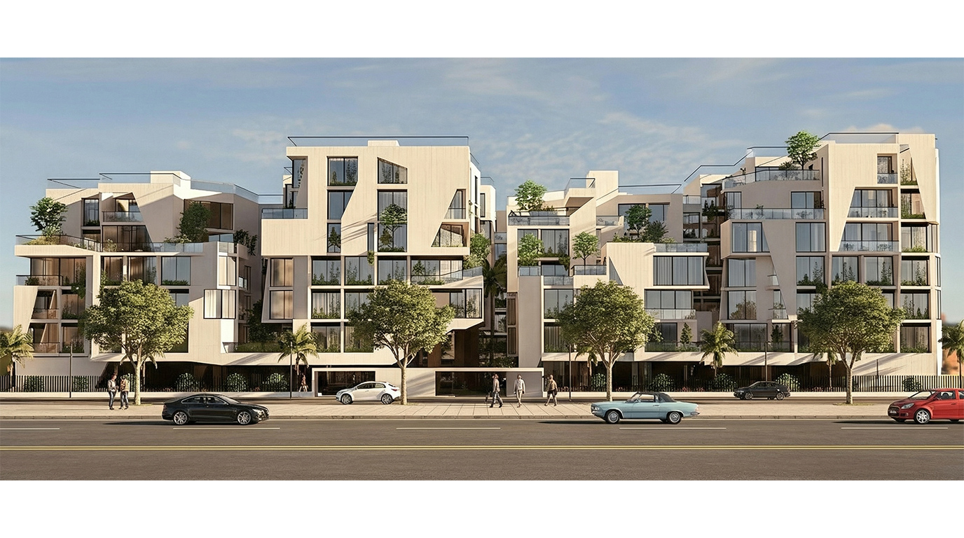 A harmonious blend of organized chaos coexists with the fluidity of the landscape, characterized by a predominance of white in the upper structures, which contrasts with the warm, wood-like ambiance of the pedestrian pathways leading to various entrances. The Oasis compound features a combination of geometric glazed volumes, fluid walkways, and landscaped areas.
