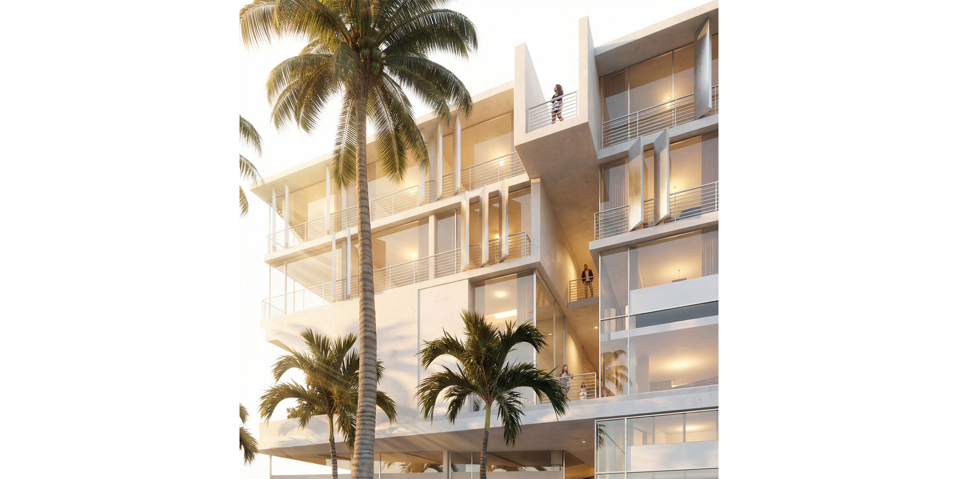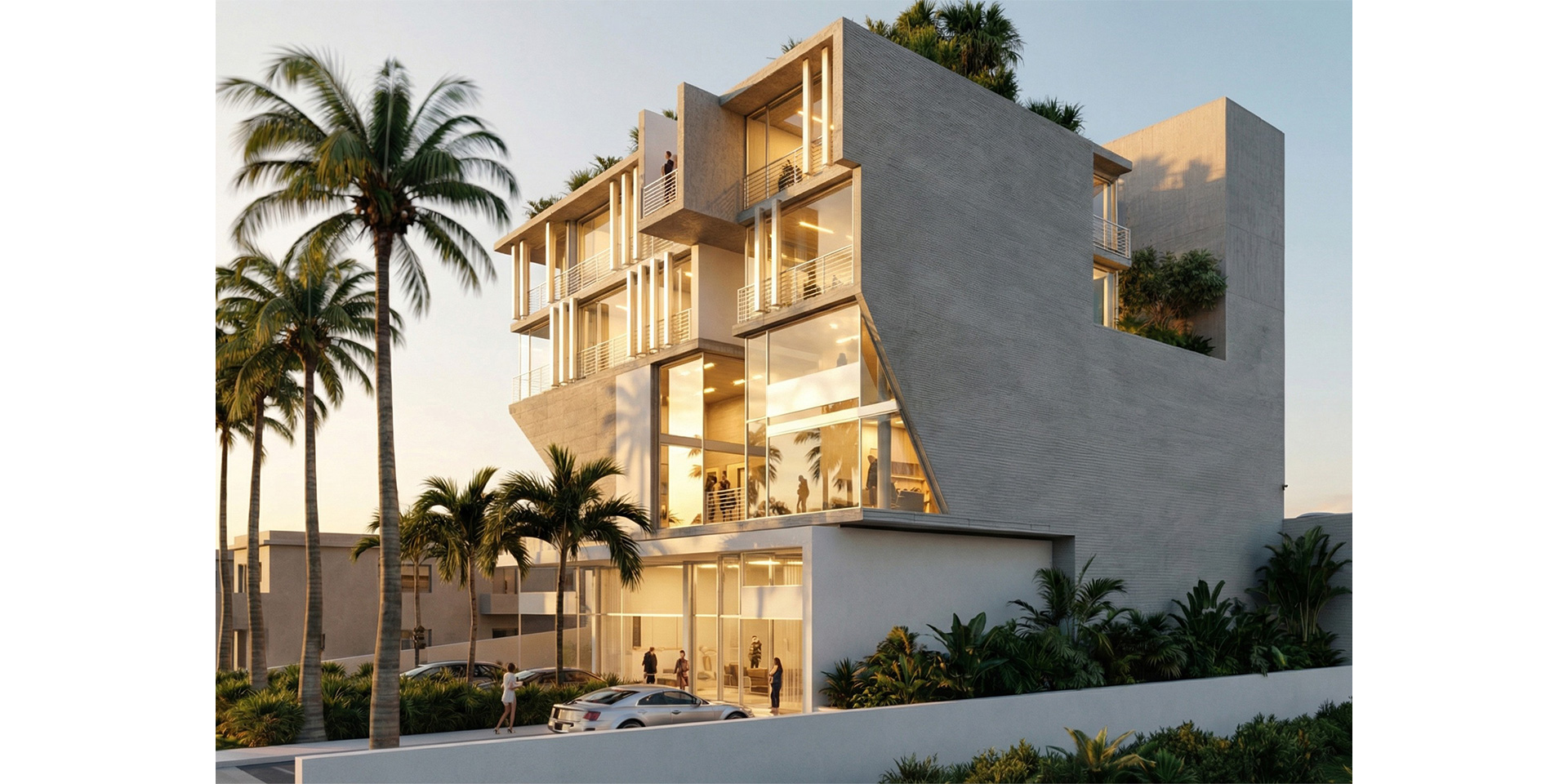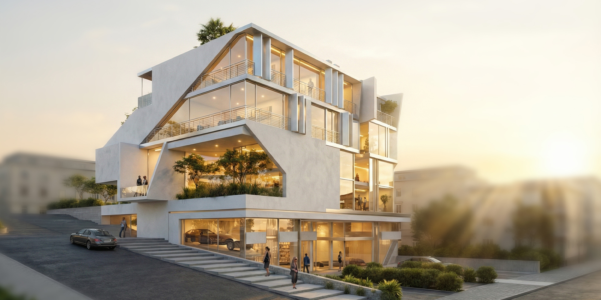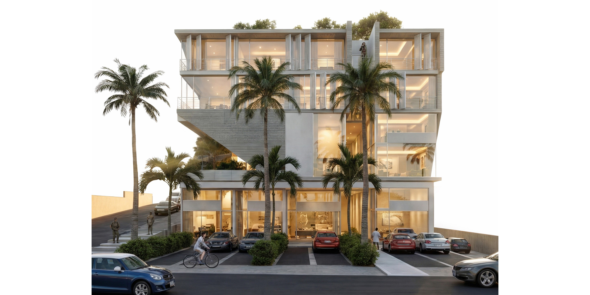 The project is organized over two commercial levels and upper office floors, unified by a sculpted concrete mass that appears carved rather than assembled. Large, carefully oriented openings are directed toward sea views, allowing light and horizon to penetrate the depth of the structure while maintaining a strong, protective envelope toward the city.