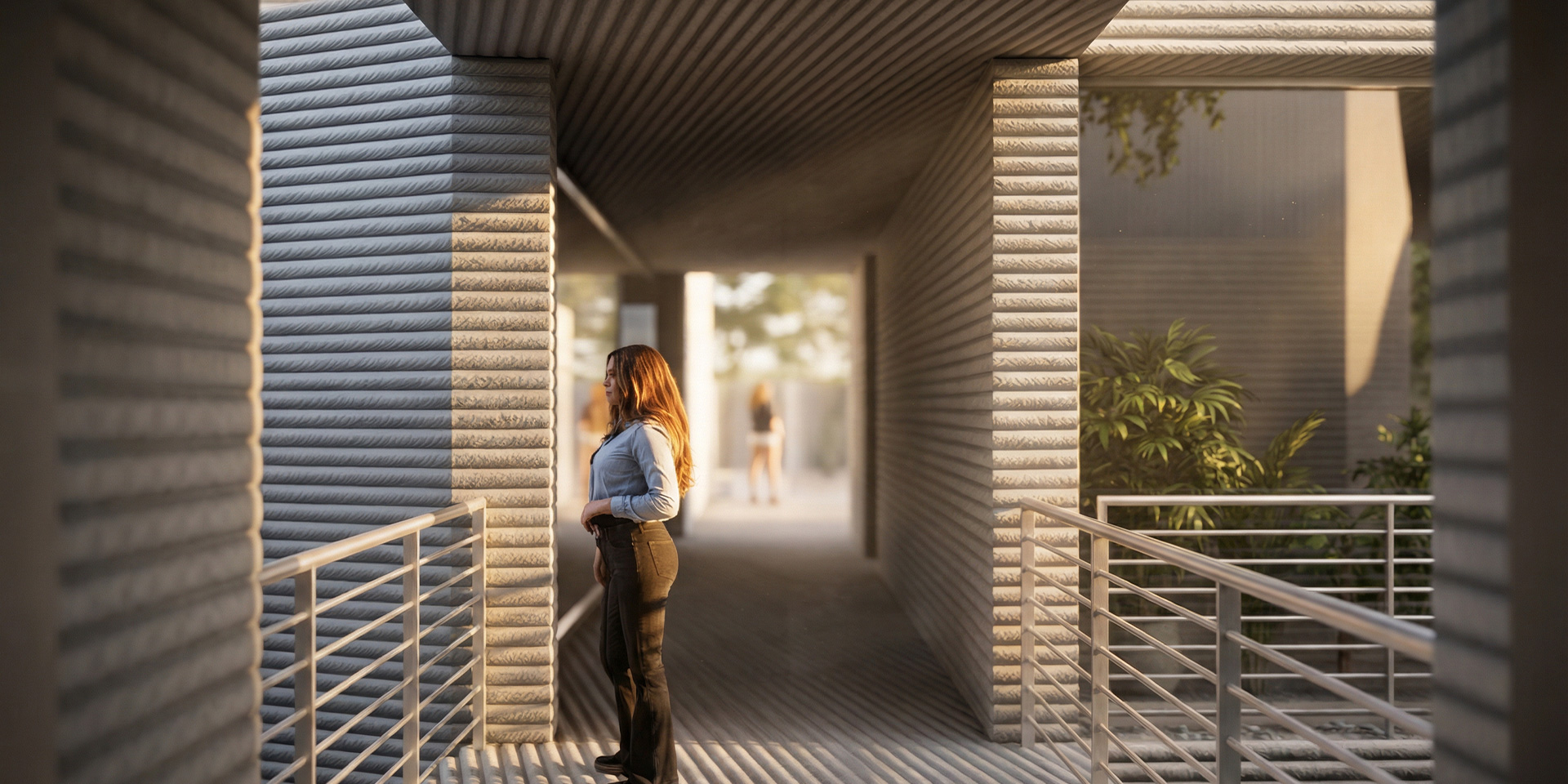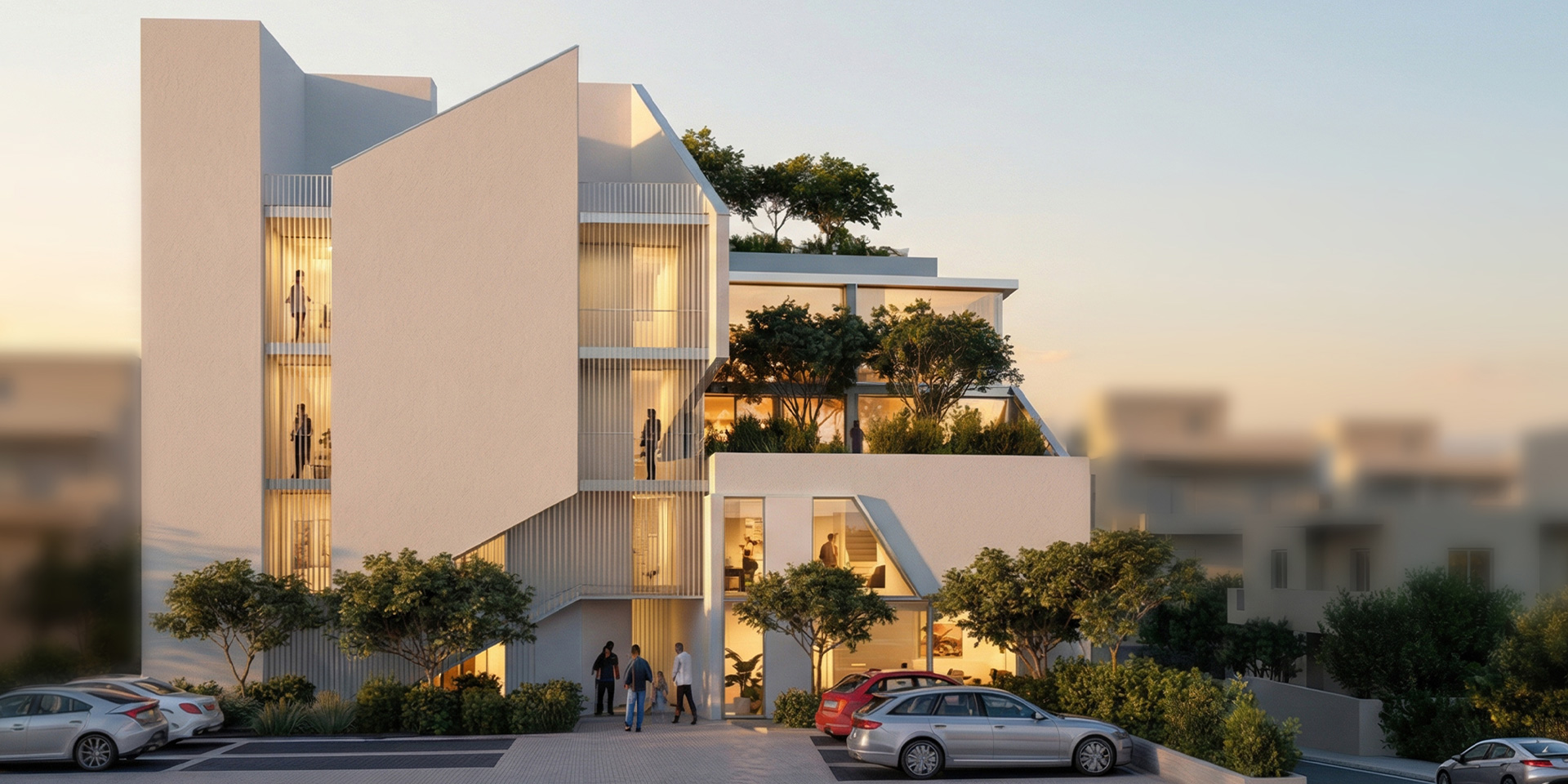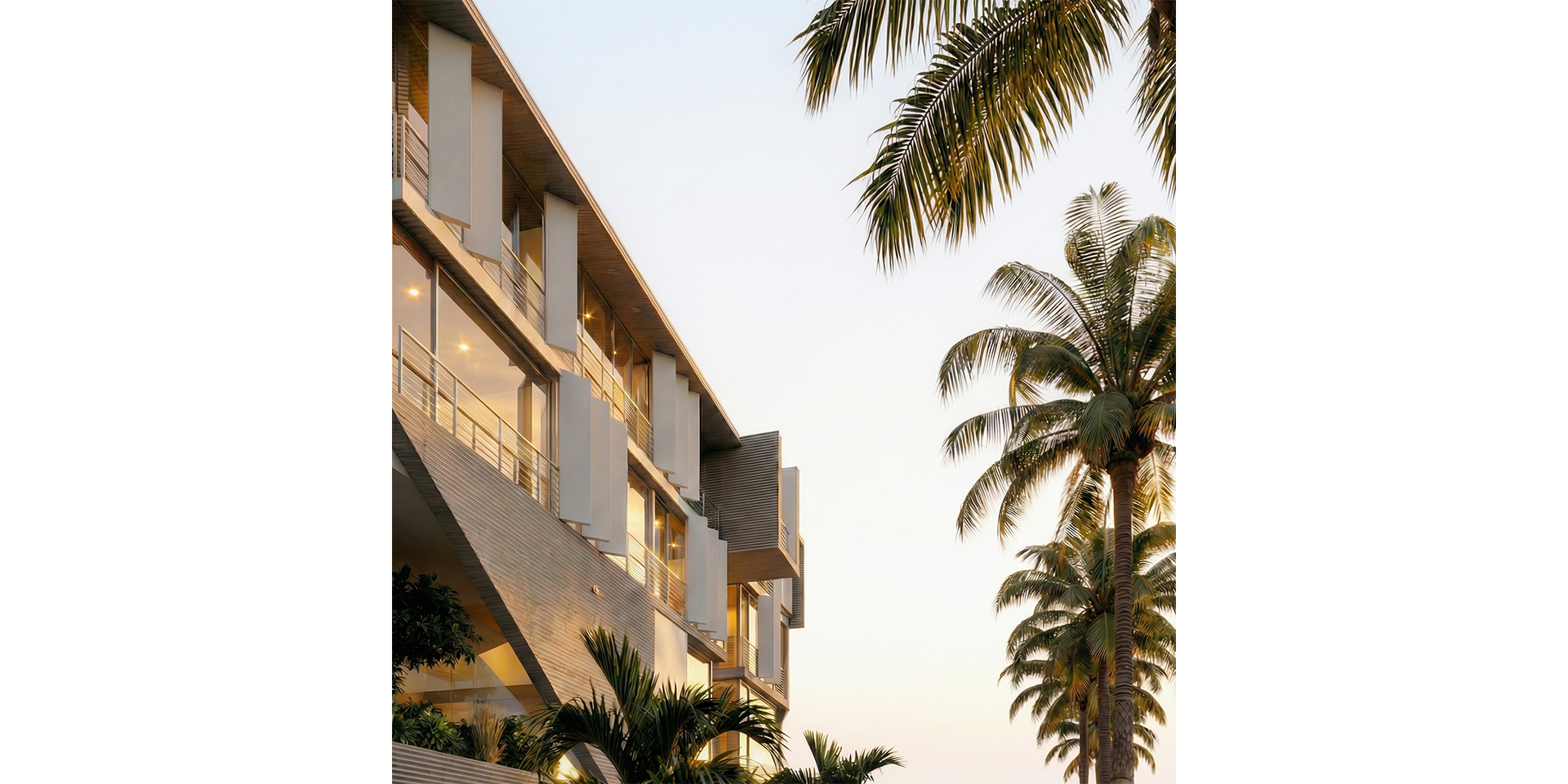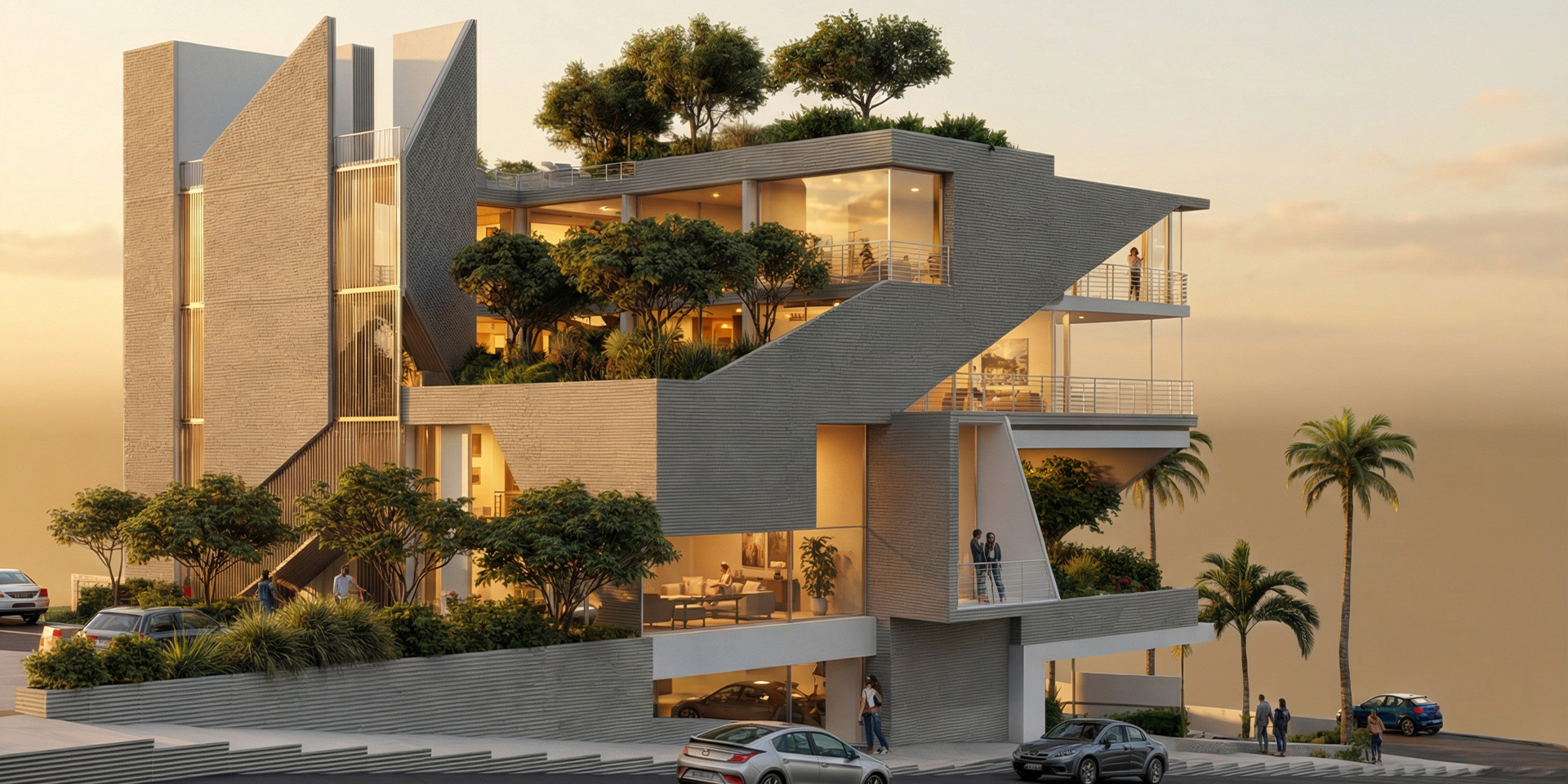 The project is organized over two commercial levels and upper office floors, unified by a sculpted concrete mass that appears carved rather than assembled. Large, carefully oriented openings are directed toward sea views, allowing light and horizon to penetrate the depth of the structure while maintaining a strong, protective envelope toward the city.
