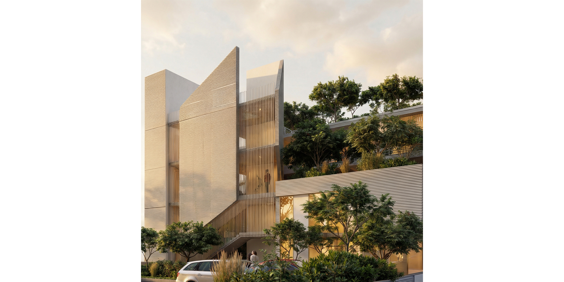 The angular geometry and inclined façade evoke motion and tension, transforming the building into a static vessel anchored to its site. Through its material honesty and expressive form, the project establishes a bold architectural presence—both grounded and dynamic—within the coastal fabric of Byblos.