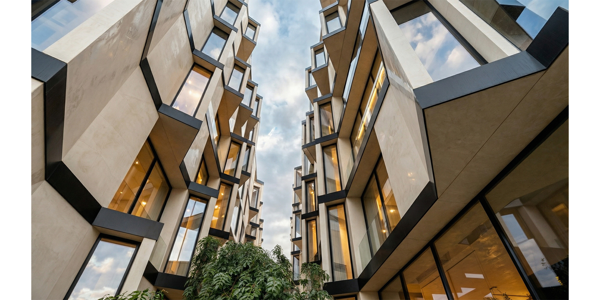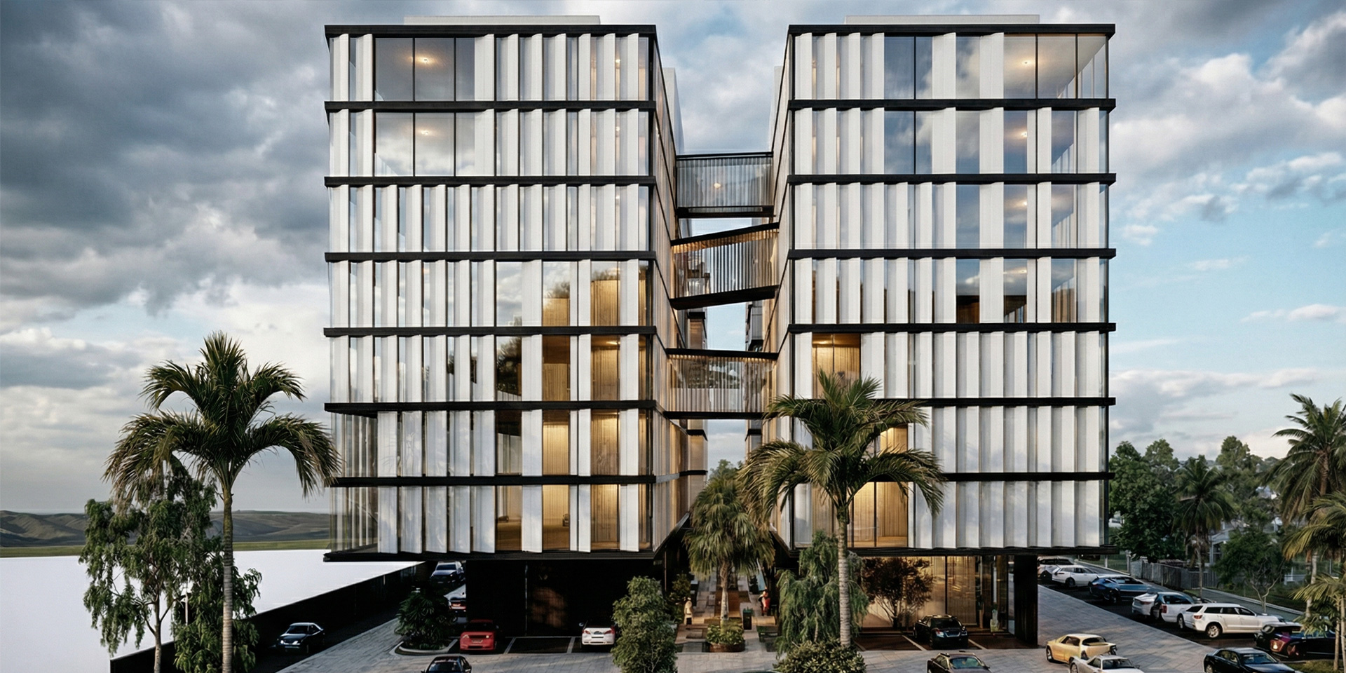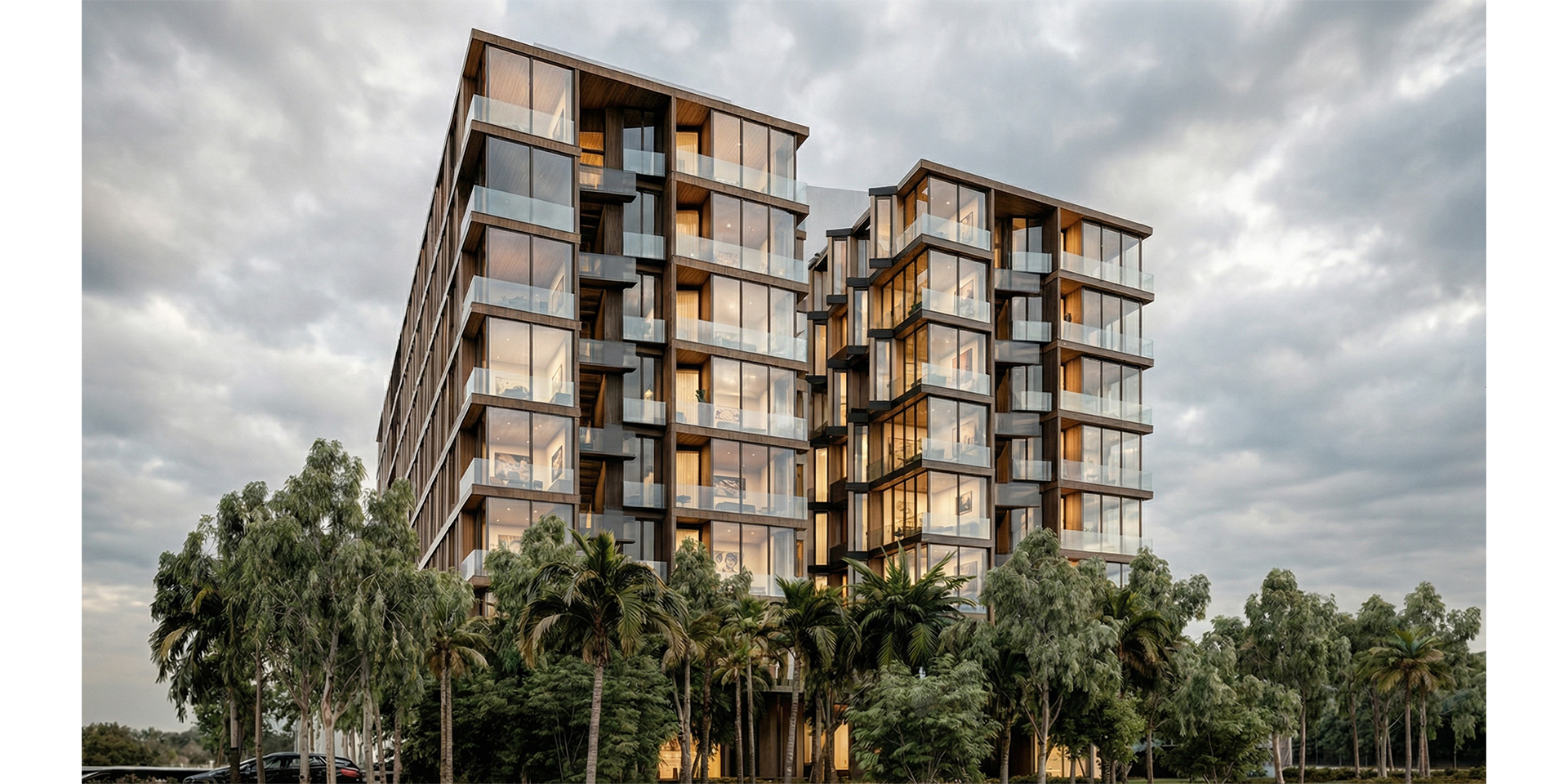The elevations facing the central void, are creatively designed with a series of randomly positioned extrusions, angled to face the greenery, ensuring privacy for the residents. The buildings are unified through the use of glazed facades, concrete and metal panels, and louvers that function as sunshades while enhancing the sense of intimacy within the living spaces.