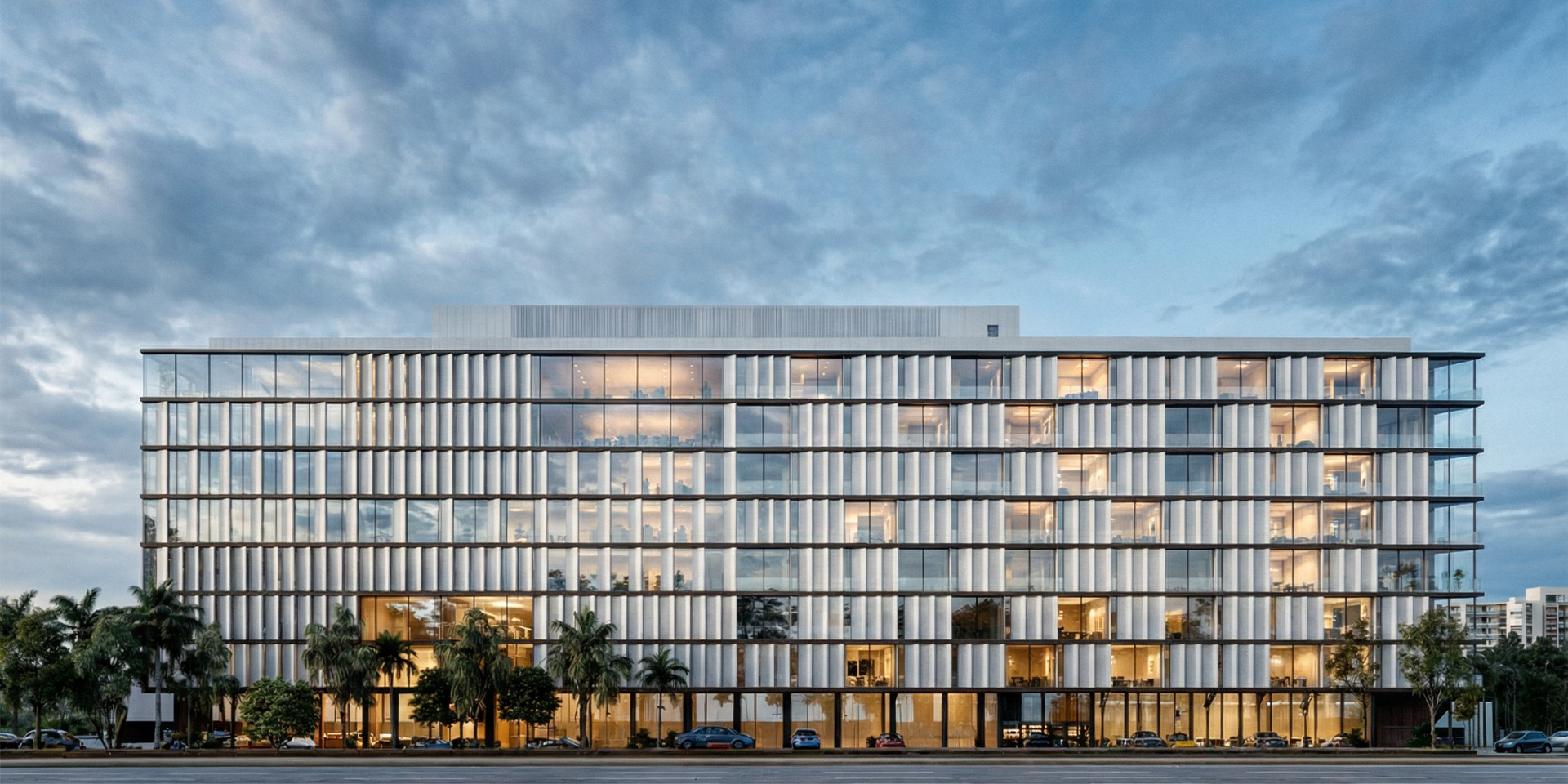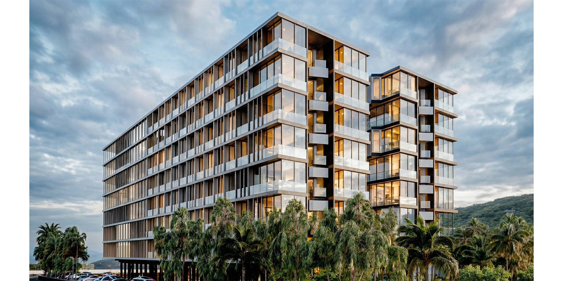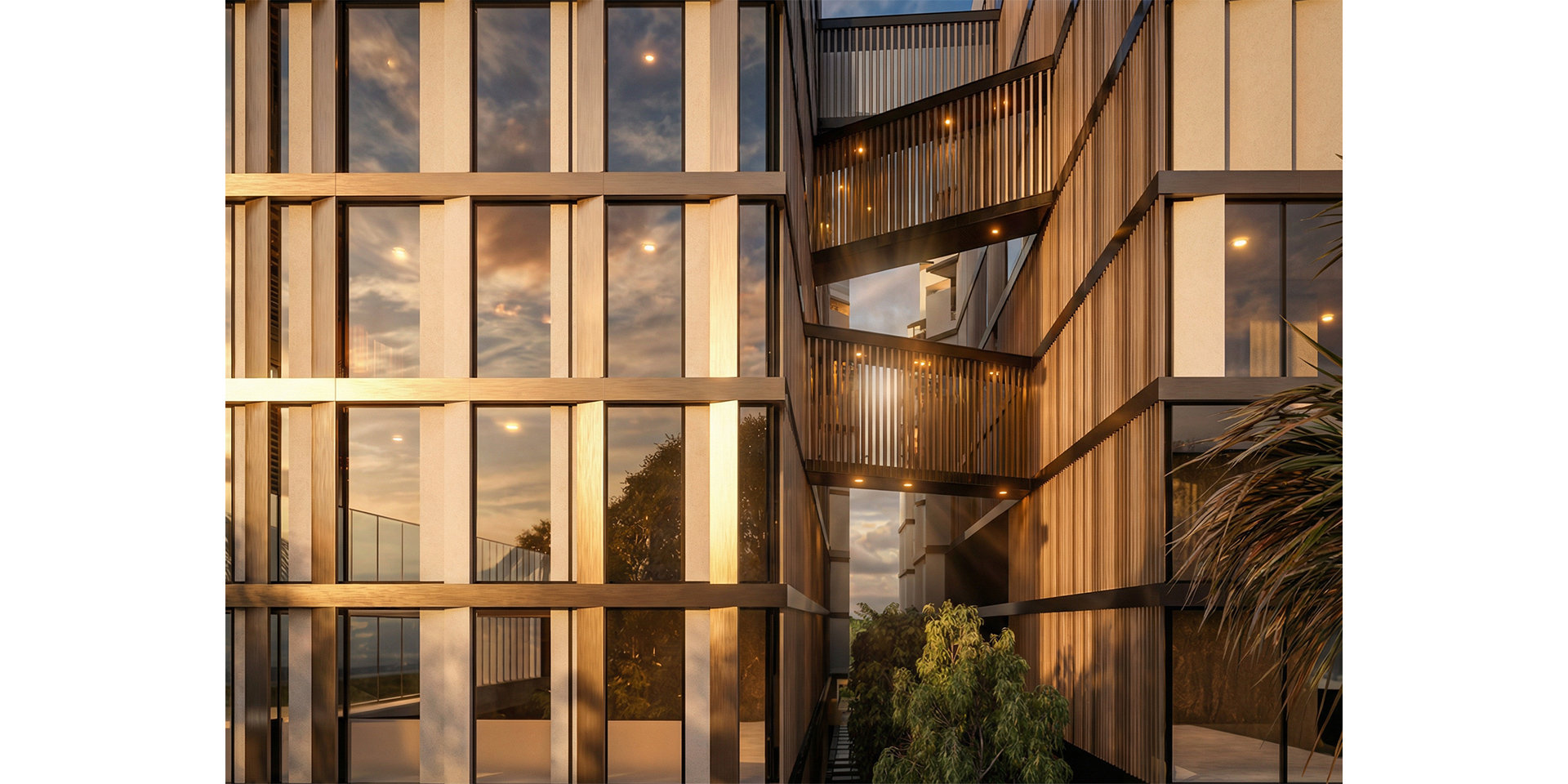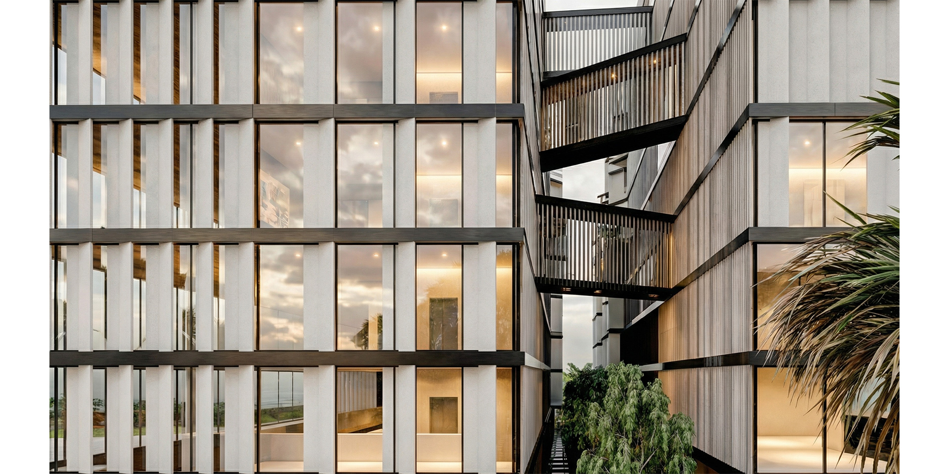 The elevations facing the central void, are creatively designed with a series of randomly positioned extrusions, angled to face the greenery, ensuring privacy for the residents. The buildings are unified through the use of glazed facades, concrete and metal panels, and louvers that function as sunshades while enhancing the sense of intimacy within the living spaces.