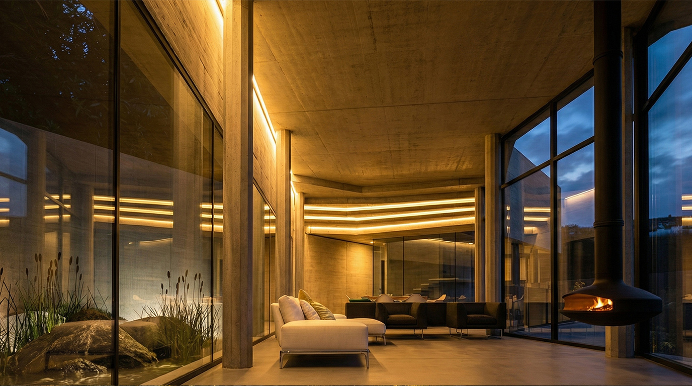 Visitors have two options for entering the home: they can choose the Roman steps that overlook a lush green patio leading to the main entrance, or they can take the panoramic elevator and stairs that descend to the lower floors. The floor plan resembles a narrow ribbon, with a concrete retaining wall on one side and a series of fragmented glass panels on the other, offering breathtaking views of the forest. The varied orientations of these panels enhance the reflections of the trees, immersing residents in the natural beauty around them.