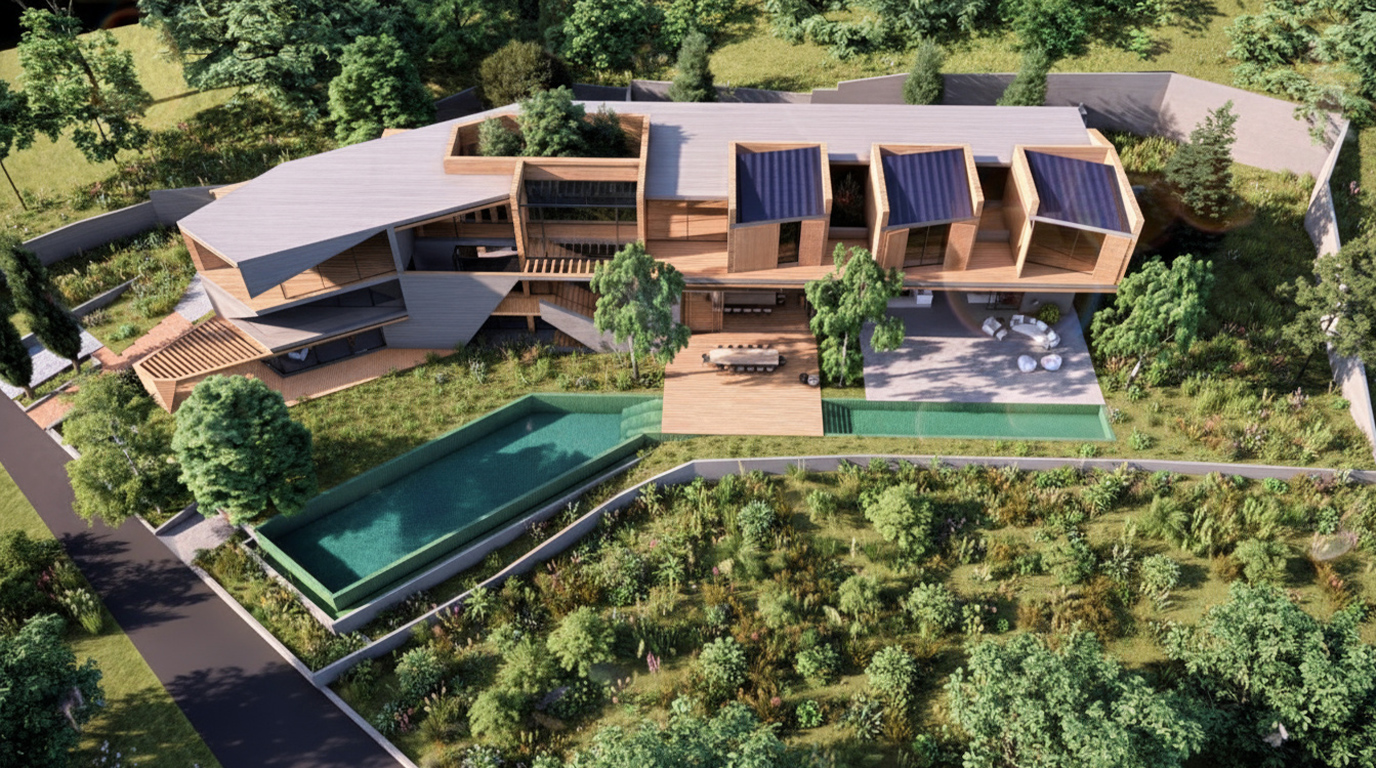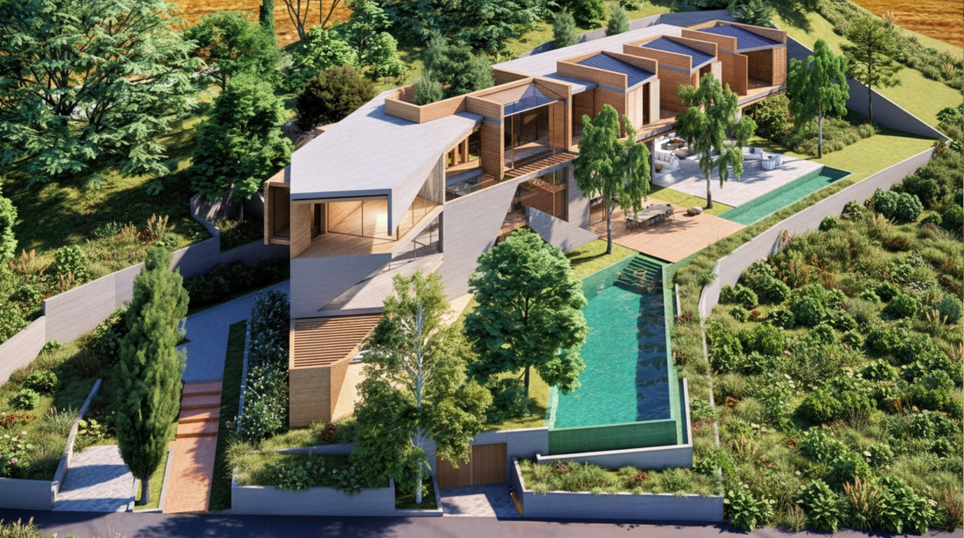 Internal and external staircases interweave circulation paths, linking all components of the house into a continuous spatial journey. A double-height entrance introduces a monumental yet fluid transition, directly connected to a reception area conceived as a sequence of fragments—each defining a specific function while remaining visually and physically linked to the garden.