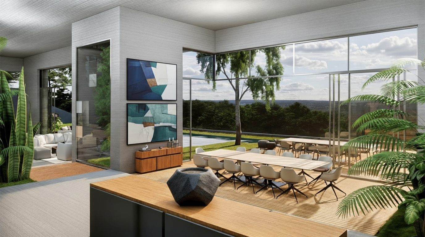 The linear implantation of the house stretches along the garden, creating an elongated façade that opens all living spaces toward the landscape. Large sliding glazed openings disappear entirely within the walls, allowing interior spaces to dissolve into the outdoor environment. Gardens penetrate the house, becoming part of the daily indoor scenery rather than a distant backdrop.