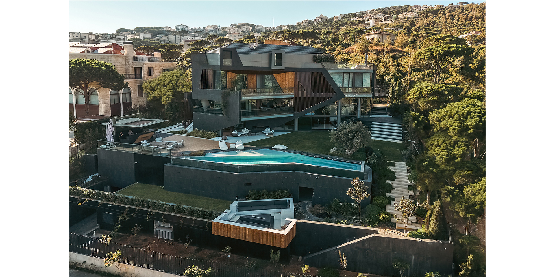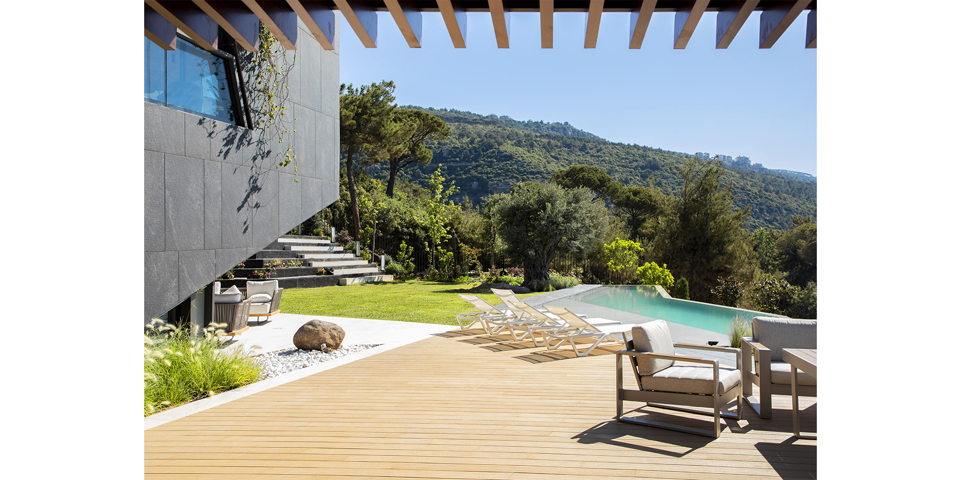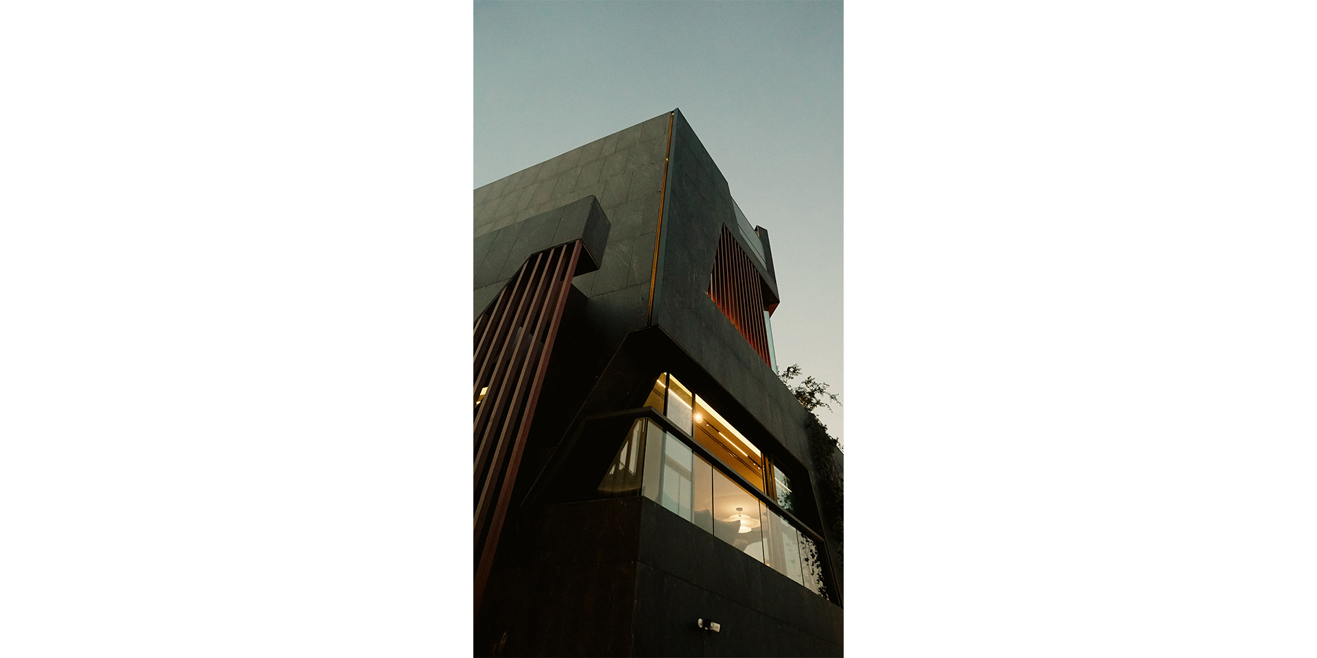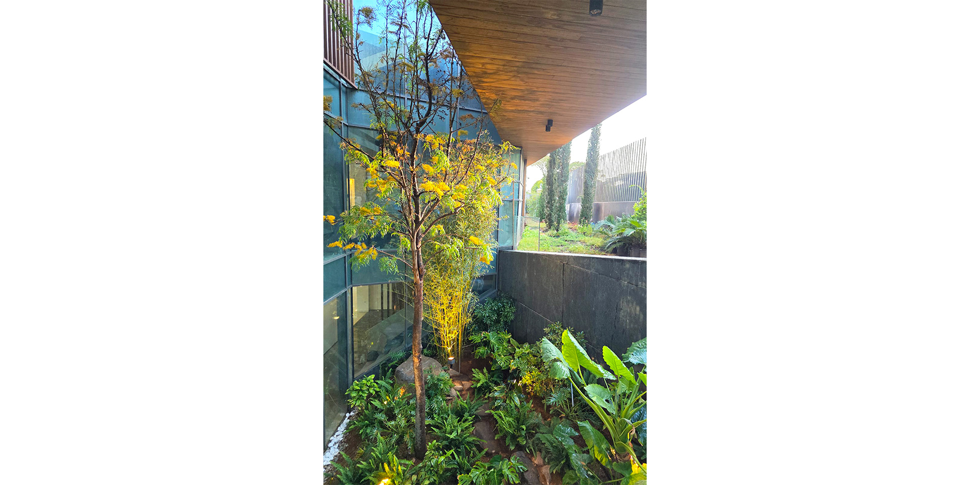 Incorporating steel and glass, the project harmonizes with nature using engineered black stone and wood, mirroring the lush surroundings. The exterior