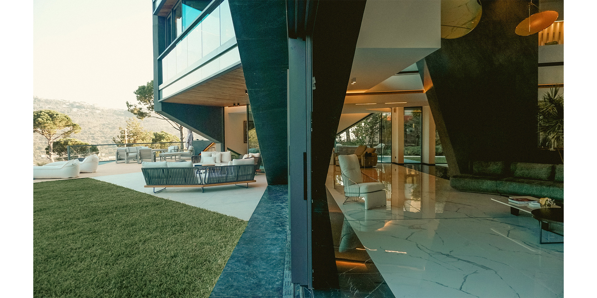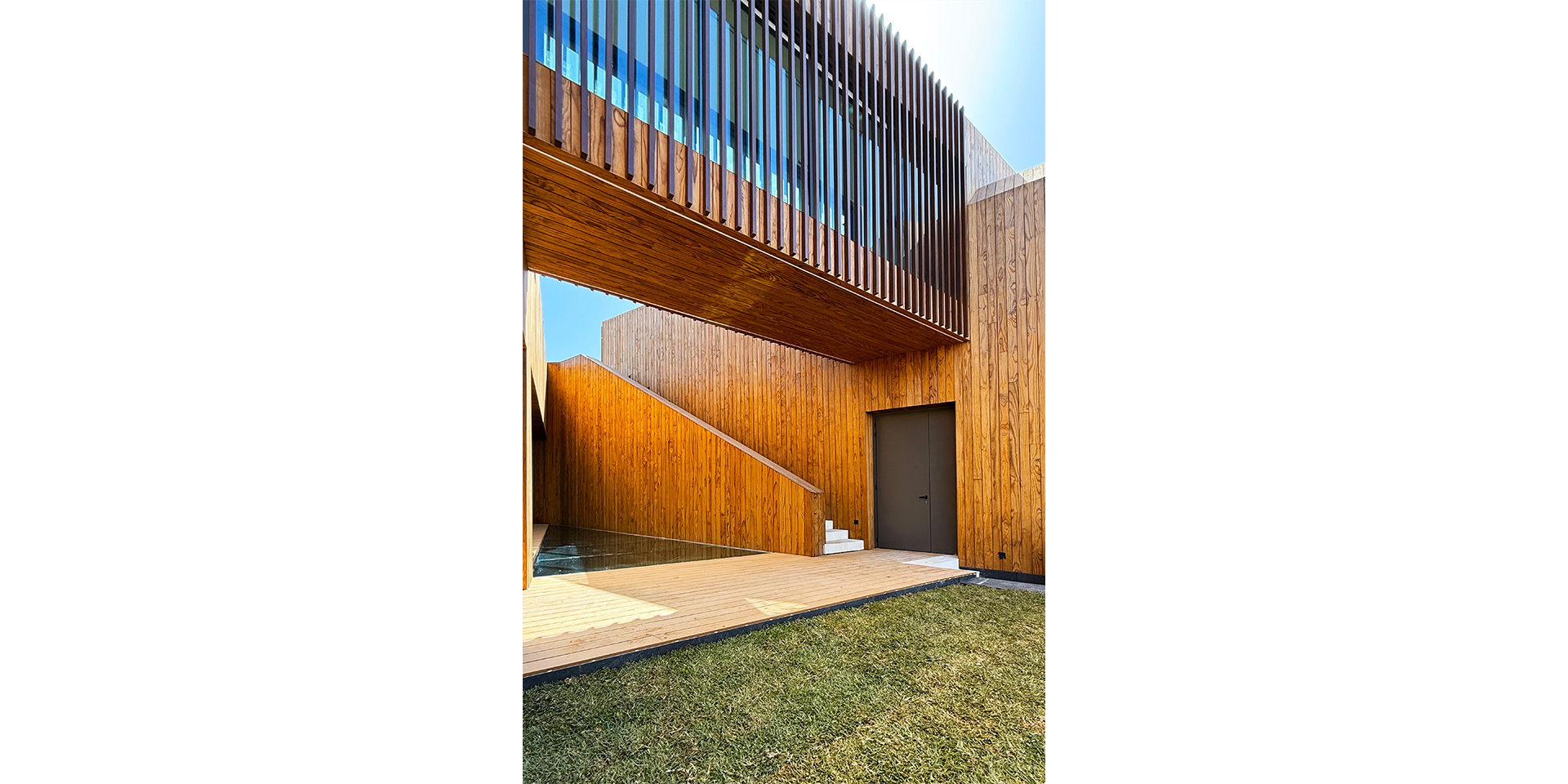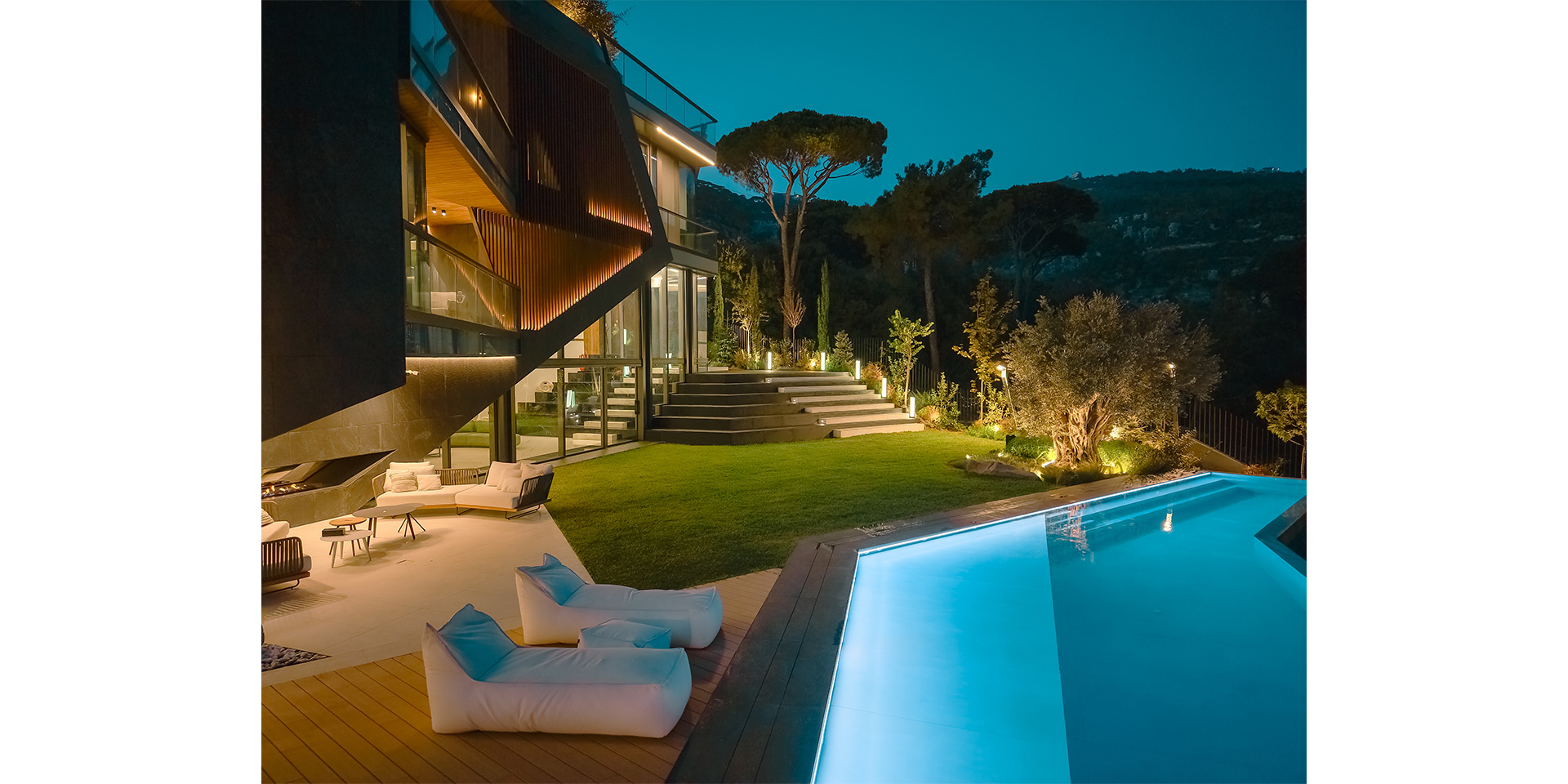 Incorporating steel and glass, the project harmonizes with nature using engineered black stone and wood, mirroring the lush surroundings. The exterior
