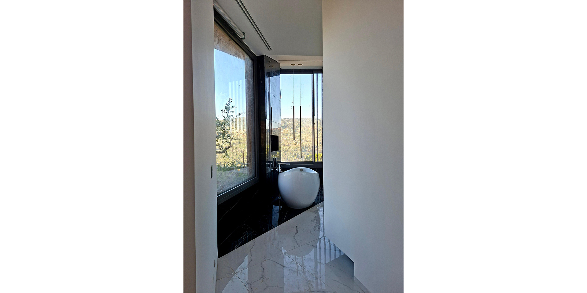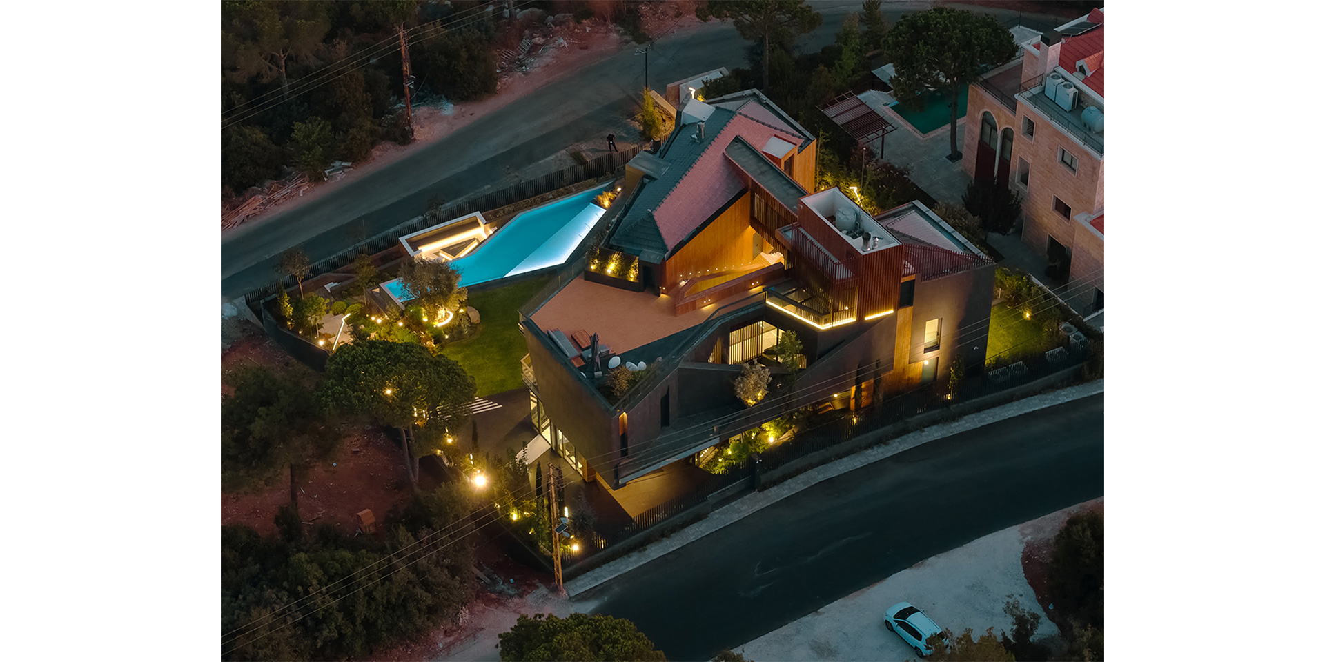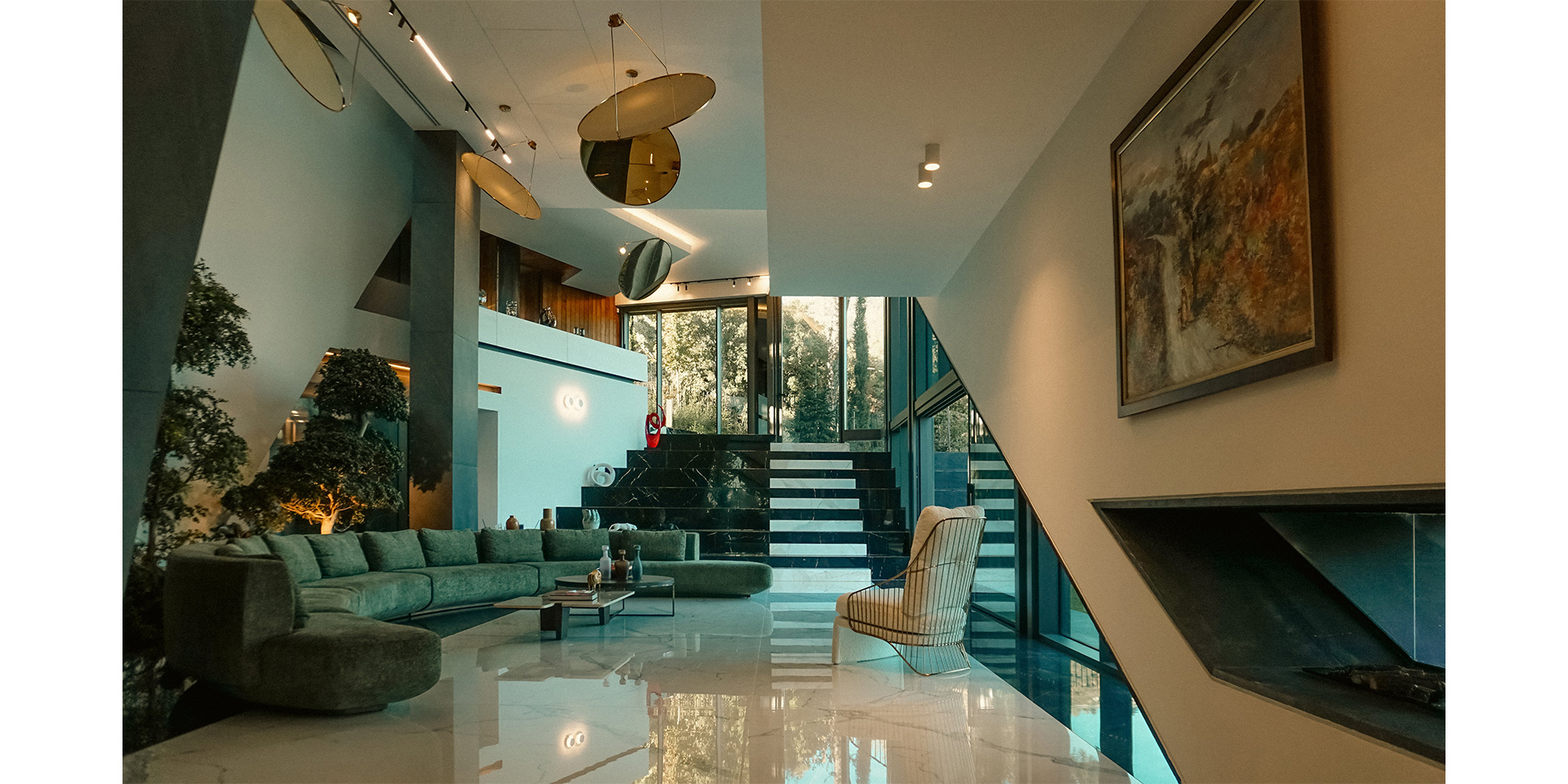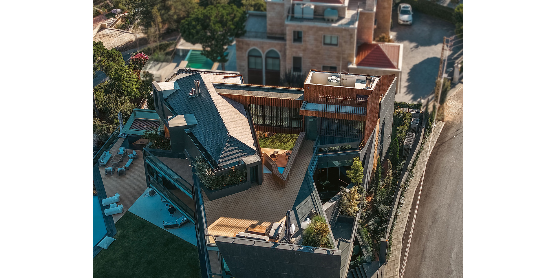 Incorporating steel and glass, the project harmonizes with nature using engineered black stone and wood, mirroring the lush surroundings. The exterior