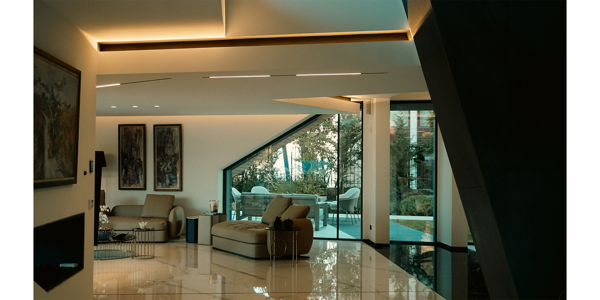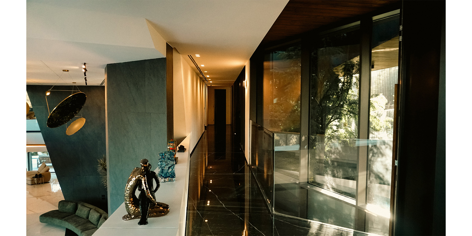 An inner garden emerges, blurring the lines between outdoors and indoors, inviting sunlight and breezes. An artful glass-floored corridor captures the