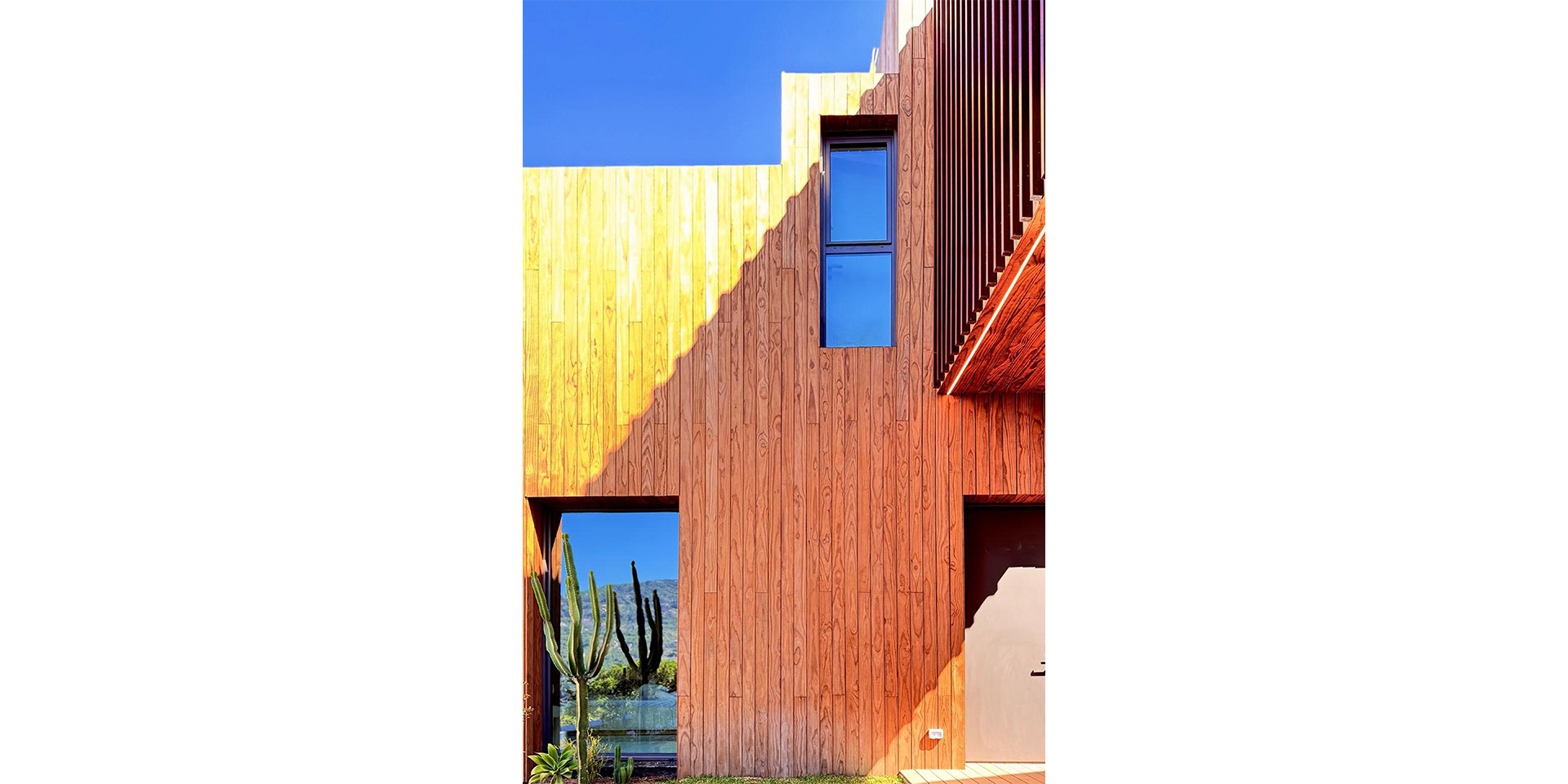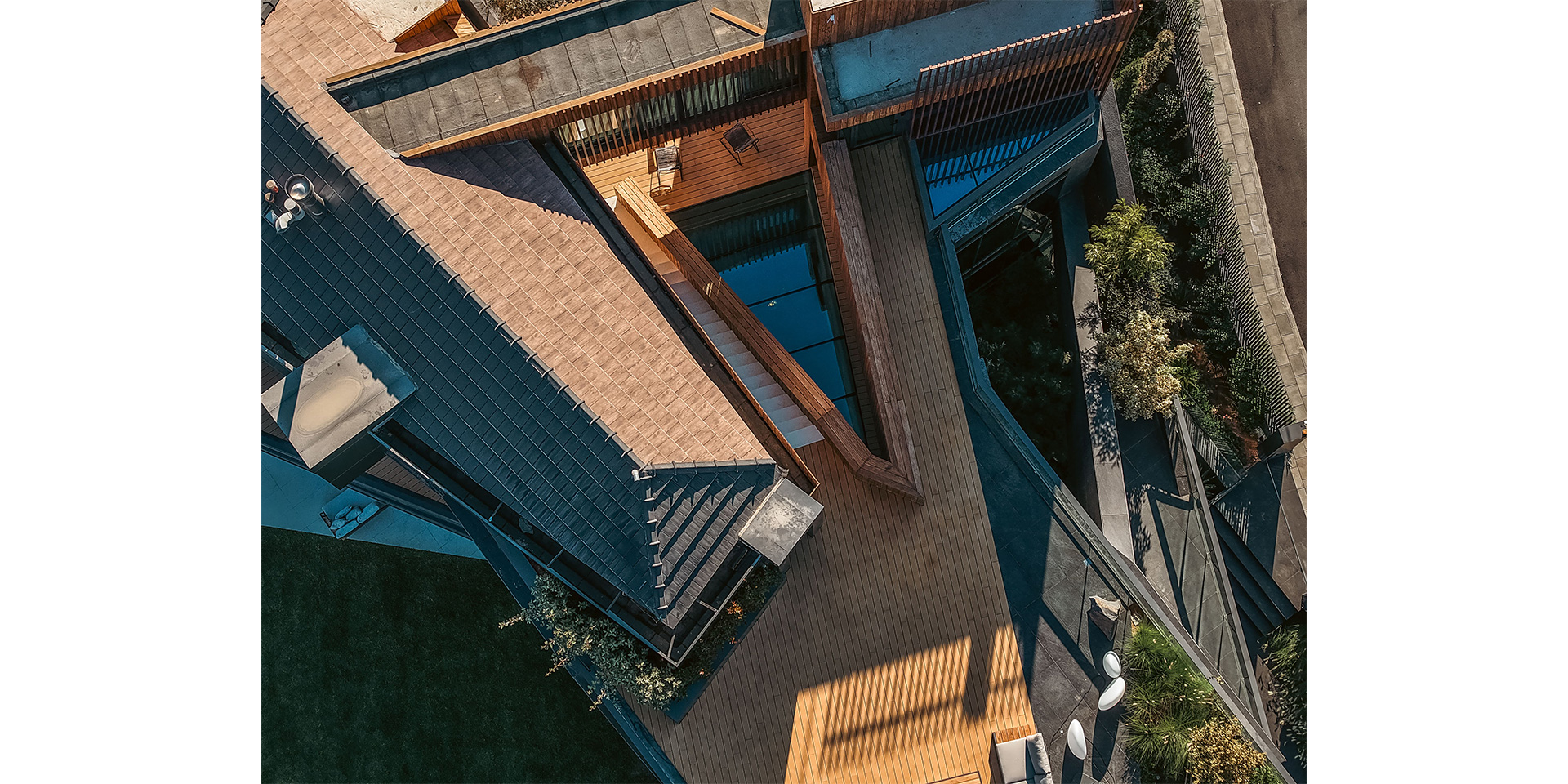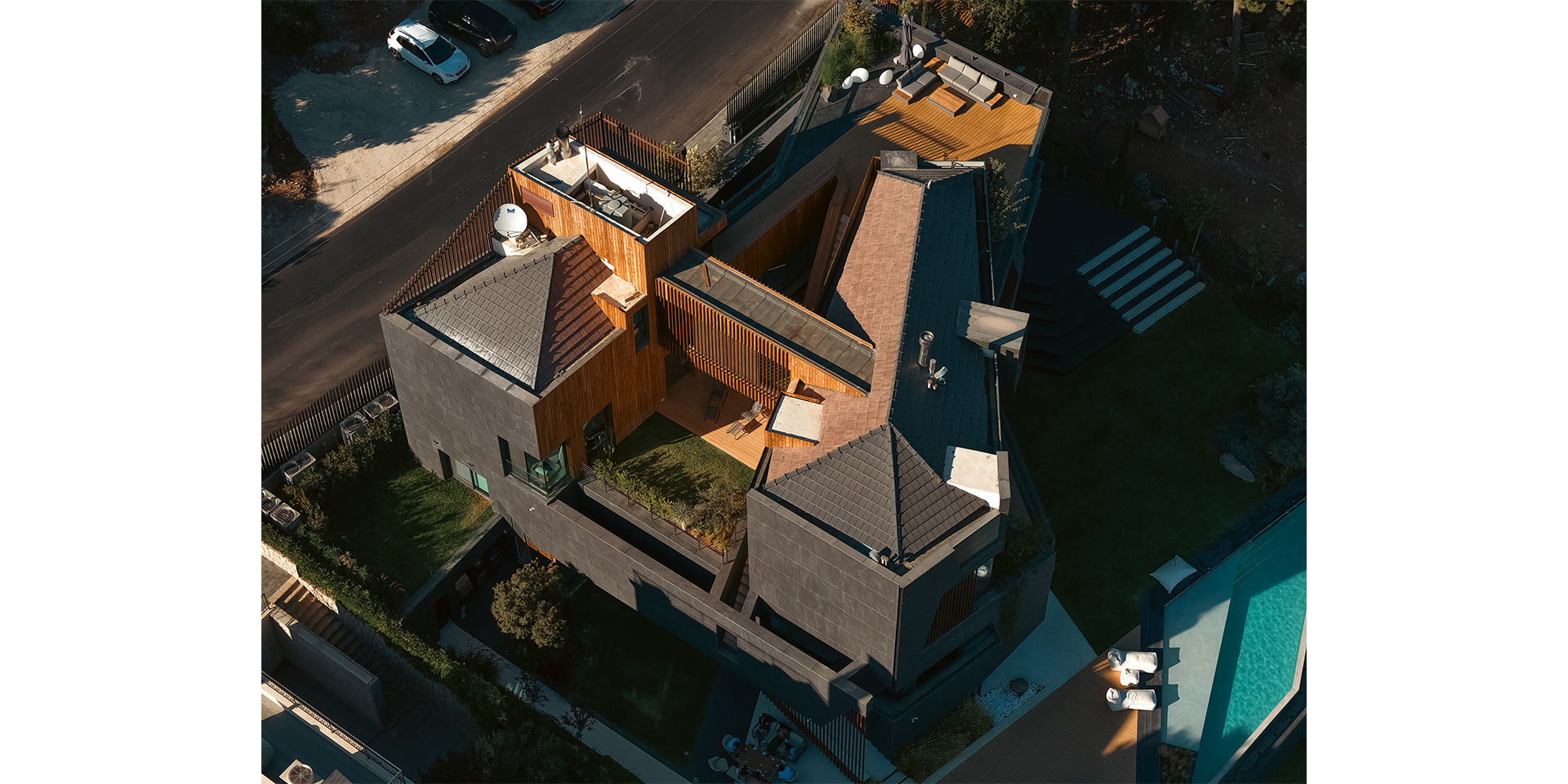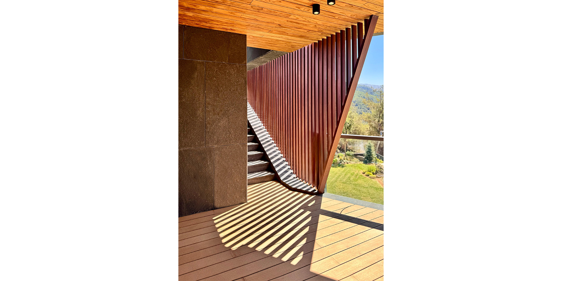 Gliding smoothly in the site, it wraps around a series of stairs leading from terrace to terrace within the heart of the residence where timber boards are exposed throughout and feature on floors, walls and ceilings.