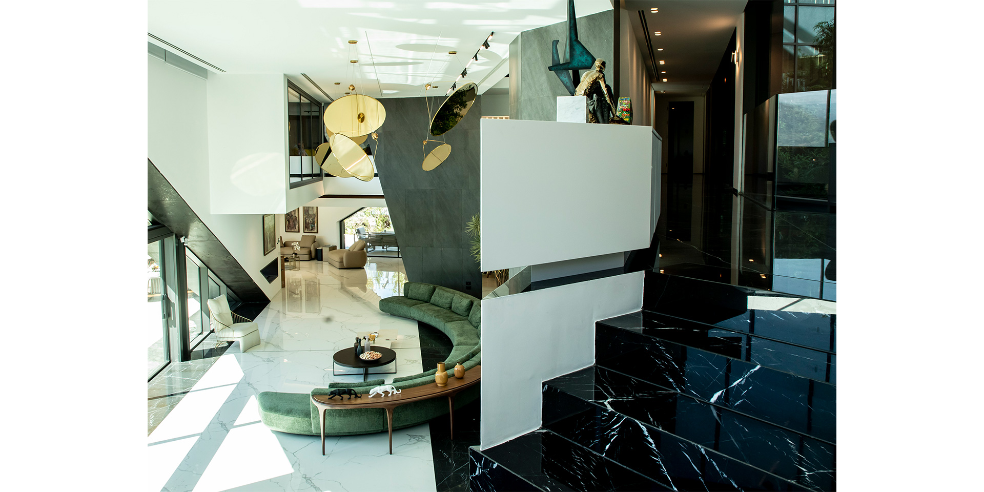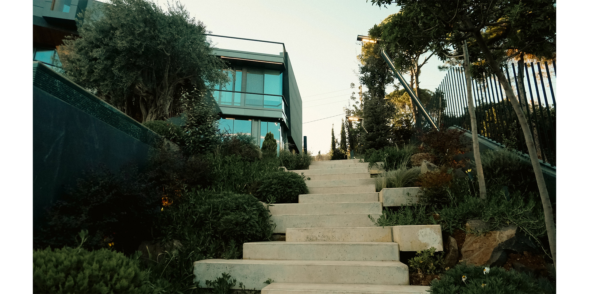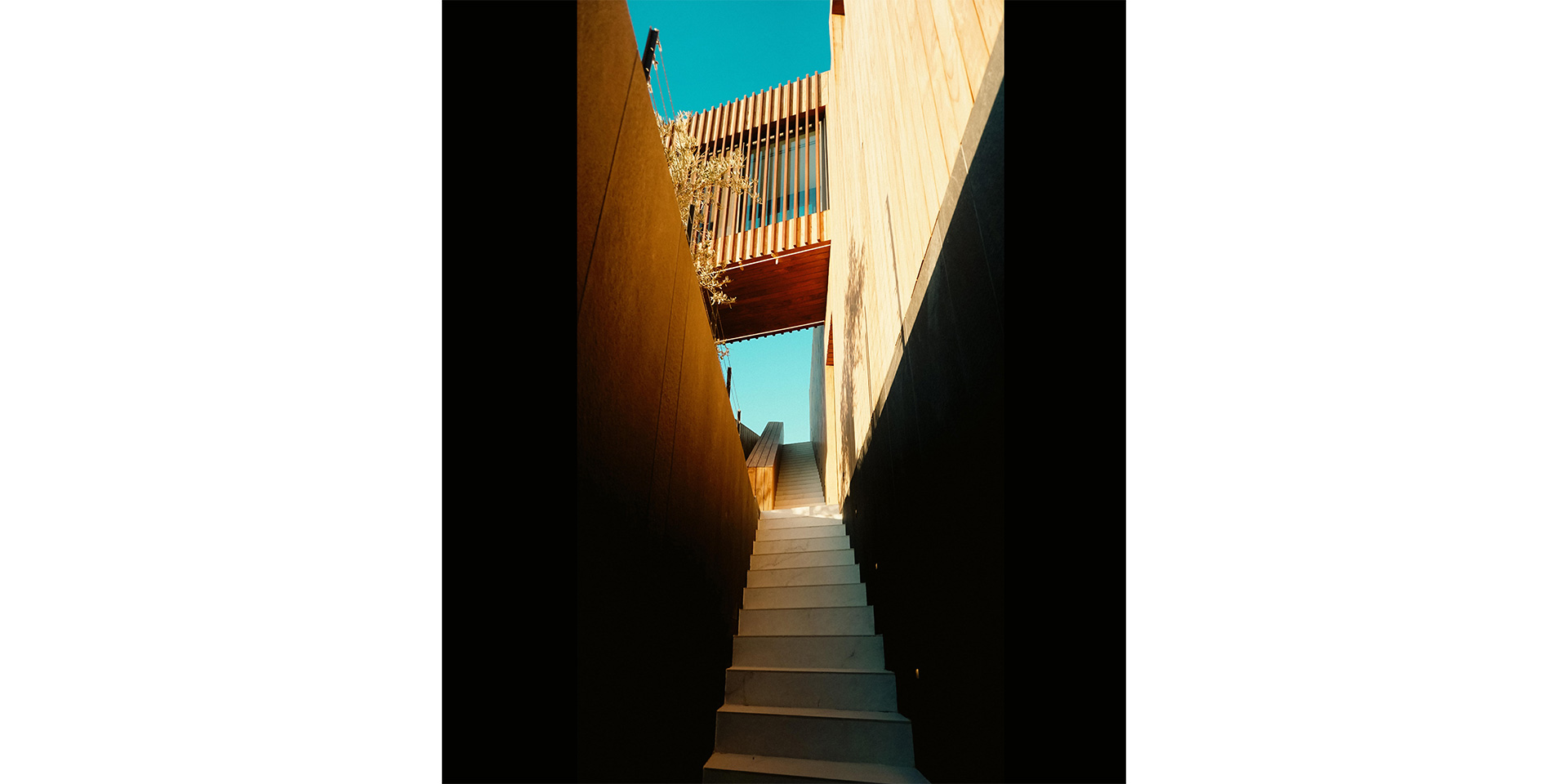 Connecting external and internal landscapes, steps form a direct pathway, revealing a sprawling vista as one enters. The house becomes a canvas for