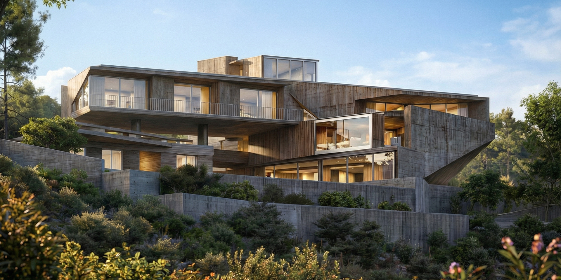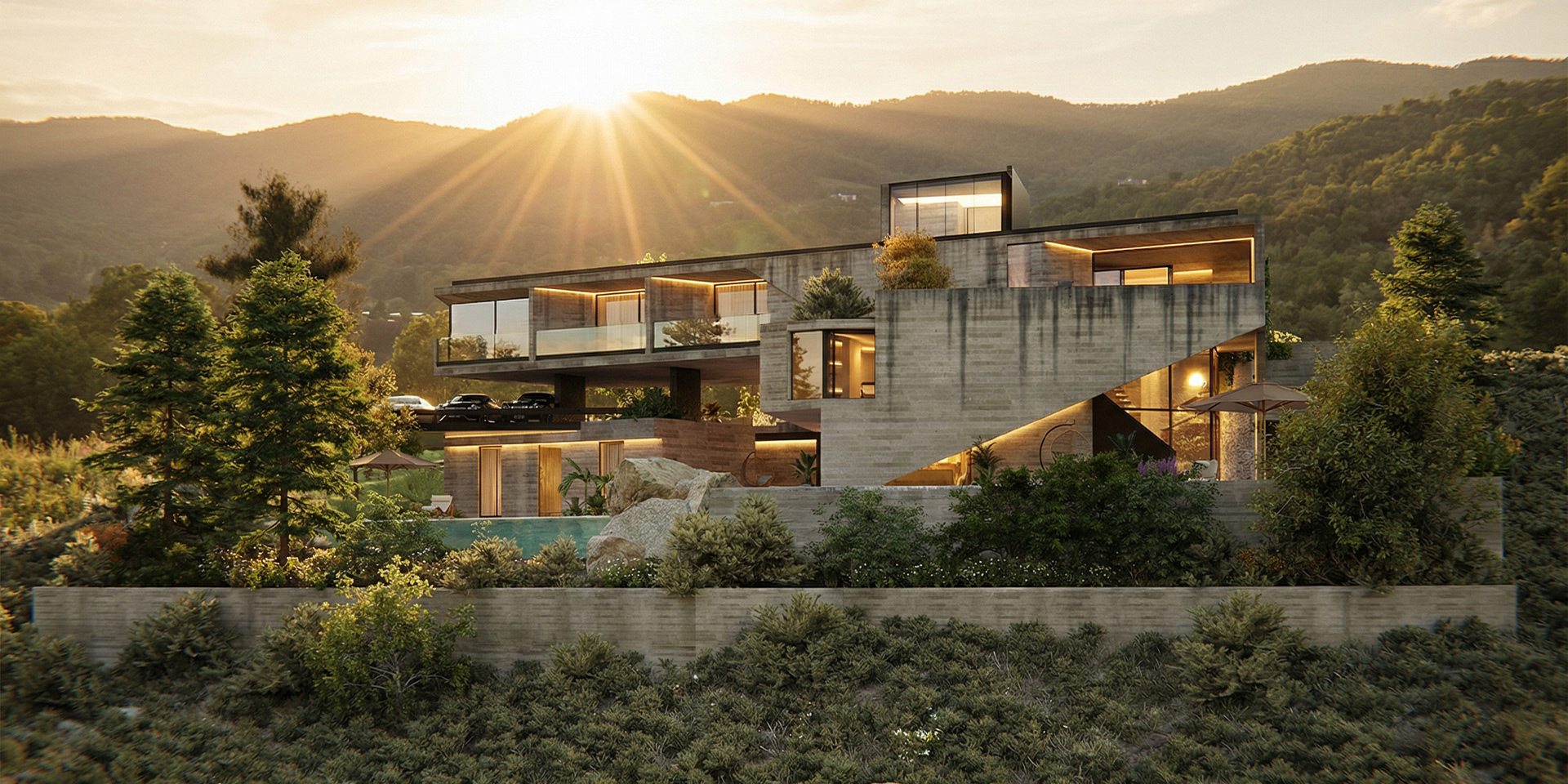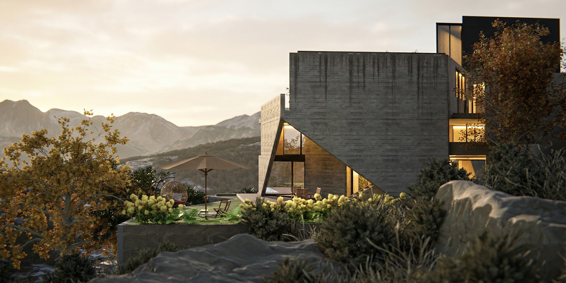 Intended to blend in with its remote surrounding, this private residence was designed to be reminiscent of the spatial and formal structure of the mountain environment.