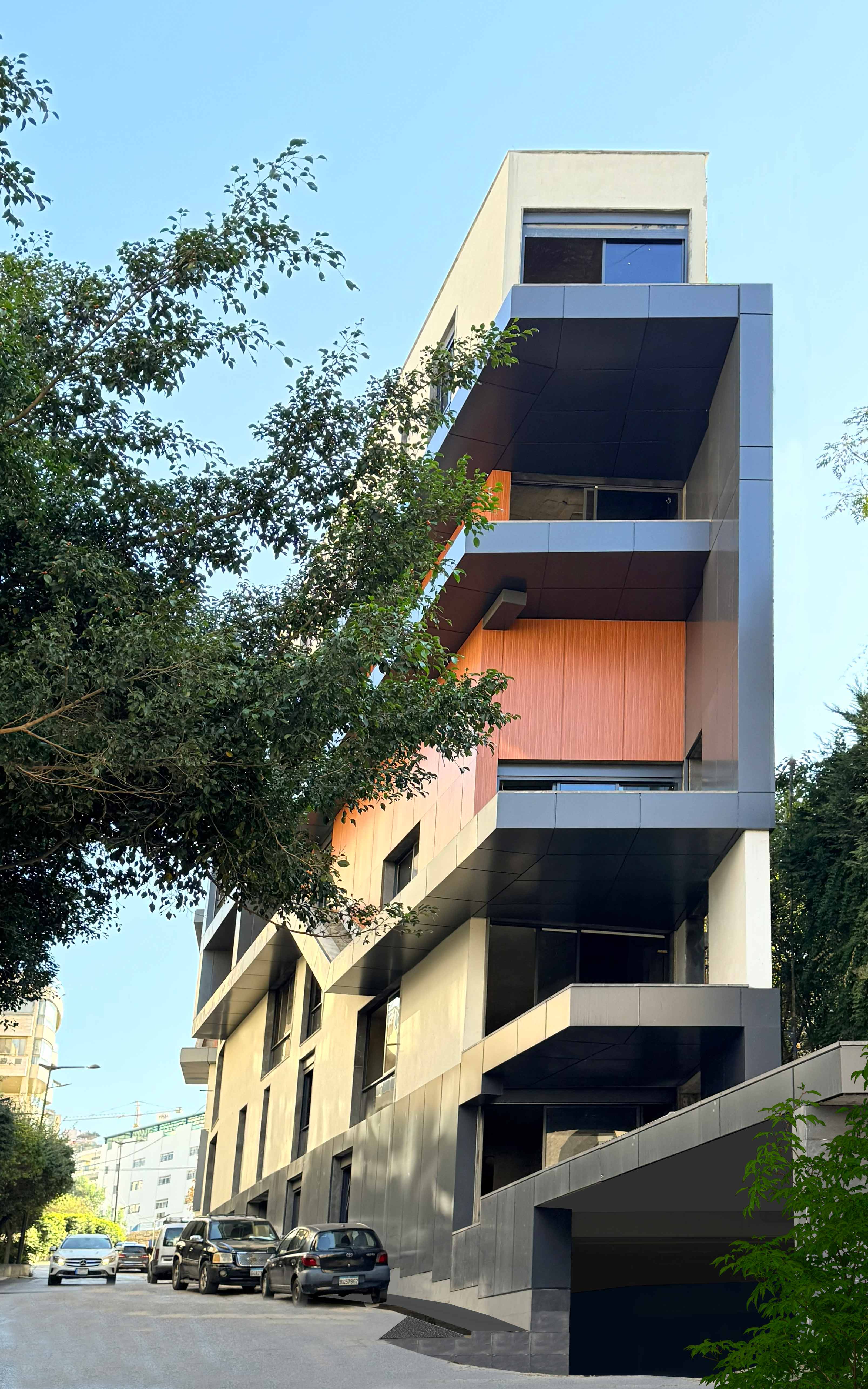 Each face shows a different number of apartments, the overall elevation unified by an urban scaled stairs carving.