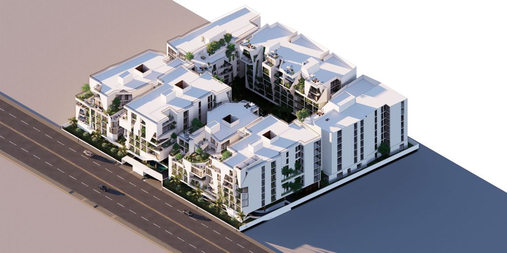 Located in Jeddah, The Oasis is a self-sufficient residential compound designed on a 10,000 square meter plot. The compound consists of seven interconnected blocks at the ground floor level, where all common public amenities are situated.