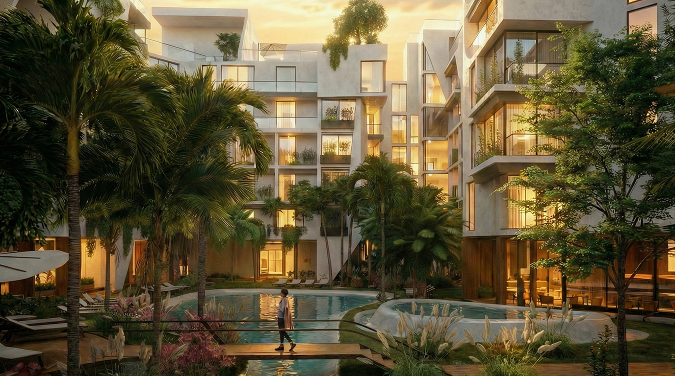 Suspended gardens and planted areas are thoughtfully integrated within the structures, enhancing the living spaces with garden-level functions. The Oasis not only offers a variety of apartments in different sizes and styles but also provides a pleasant escape from everyday life, enveloped in a lush, green atmosphere.