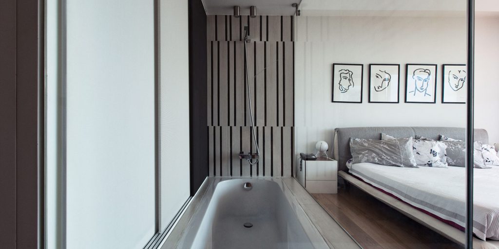 A white painted jacuzzi , surrounded by greeneries, is elevated from the main external seating area through a wooden deck facing the horizon, linking the external world to the suspended urban garden